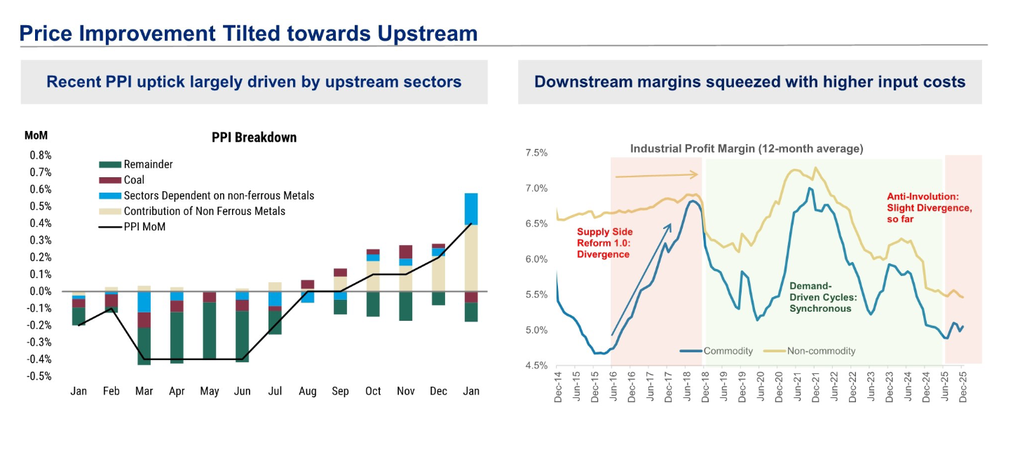通缩向低通胀的转型进程缓慢,研报中GDP平减指数同比走势(研报再通胀章节) 显示,这一过程将耗时16个季度,直至2027年实现低通胀。而价格修复呈现明显的上游倾斜特征,PPI环比拆解图(研报价格章节) 显示,近期PPI回升几乎由煤炭、有色金属等上游板块驱动,下游行业则因原材料成本上升持续被挤压利润率,工业利润率图表中,大宗商品与非大宗商品板块利润率走势分歧持续扩大,成为产业结构的显著特征。