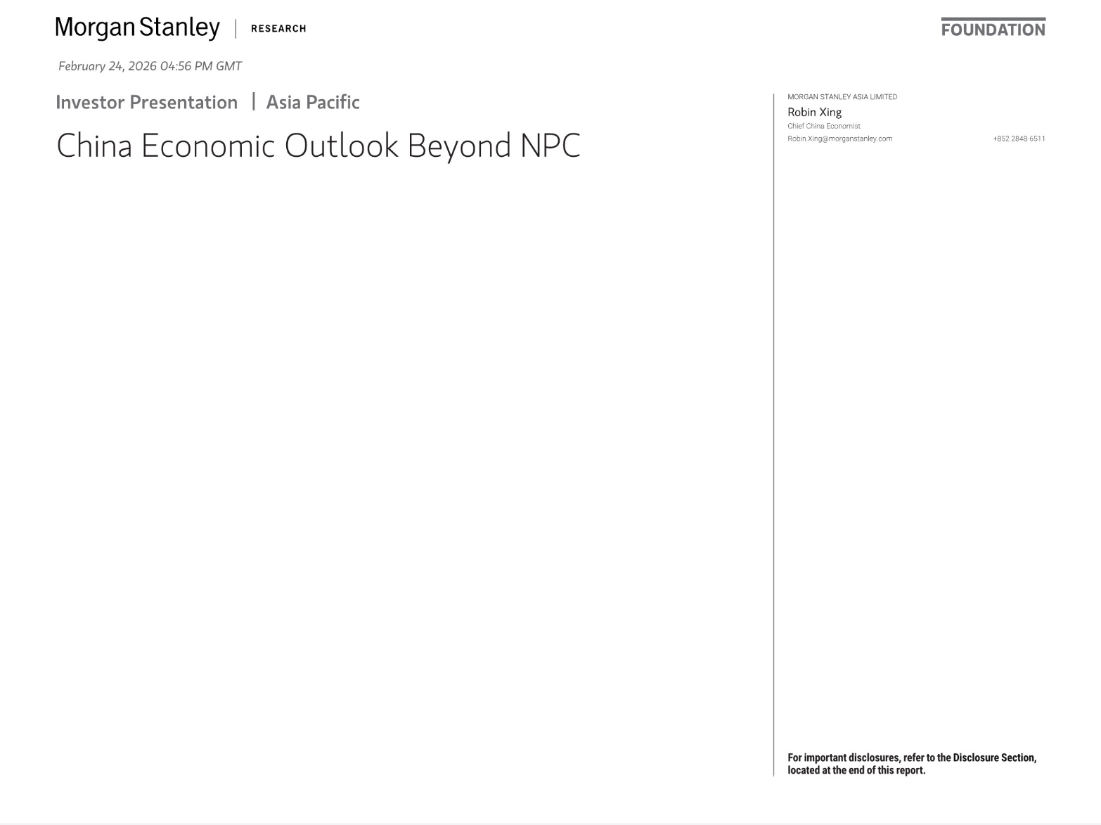 摩根士丹利亚洲有限公司于2026年2月24日发布《中国经济展望(两会后)》研报,首席中国经济学家Robin Xing团队核心研判:中国经济正从通缩向低通胀缓慢过渡,2027年完成转型,制造业出口仍是核心支撑,而消费疲软、地产调整、上游价格分化成为复苏关键掣肘,政策端则以“5R”再通胀策略稳步推进经济再平衡。
