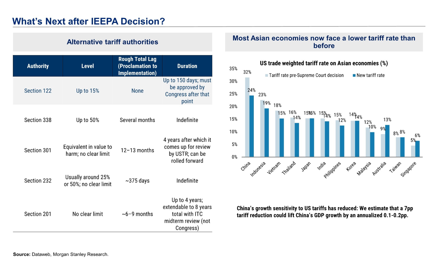 美国关税对中国经济的影响已显著弱化,研报中美国对亚洲经济体加权关税率对比图(研报关税章节) 显示,最高法院裁决后,多数亚洲经济体关税均有下降,中国关税也从此前的32%降至24%,而团队测算,7个百分点的关税减免仅能拉动中国GDP年化增速0.1-0.2个百分点,印证中国经济对美关税敏感度大幅降低。同时研报中美国替代关税授权表(研报第4页) 详细列明Section122、338等五类关税工具的税率、实施滞后时间与有效期,不同工具的政策弹性差异显著,也为贸易环境提供了更多变量。