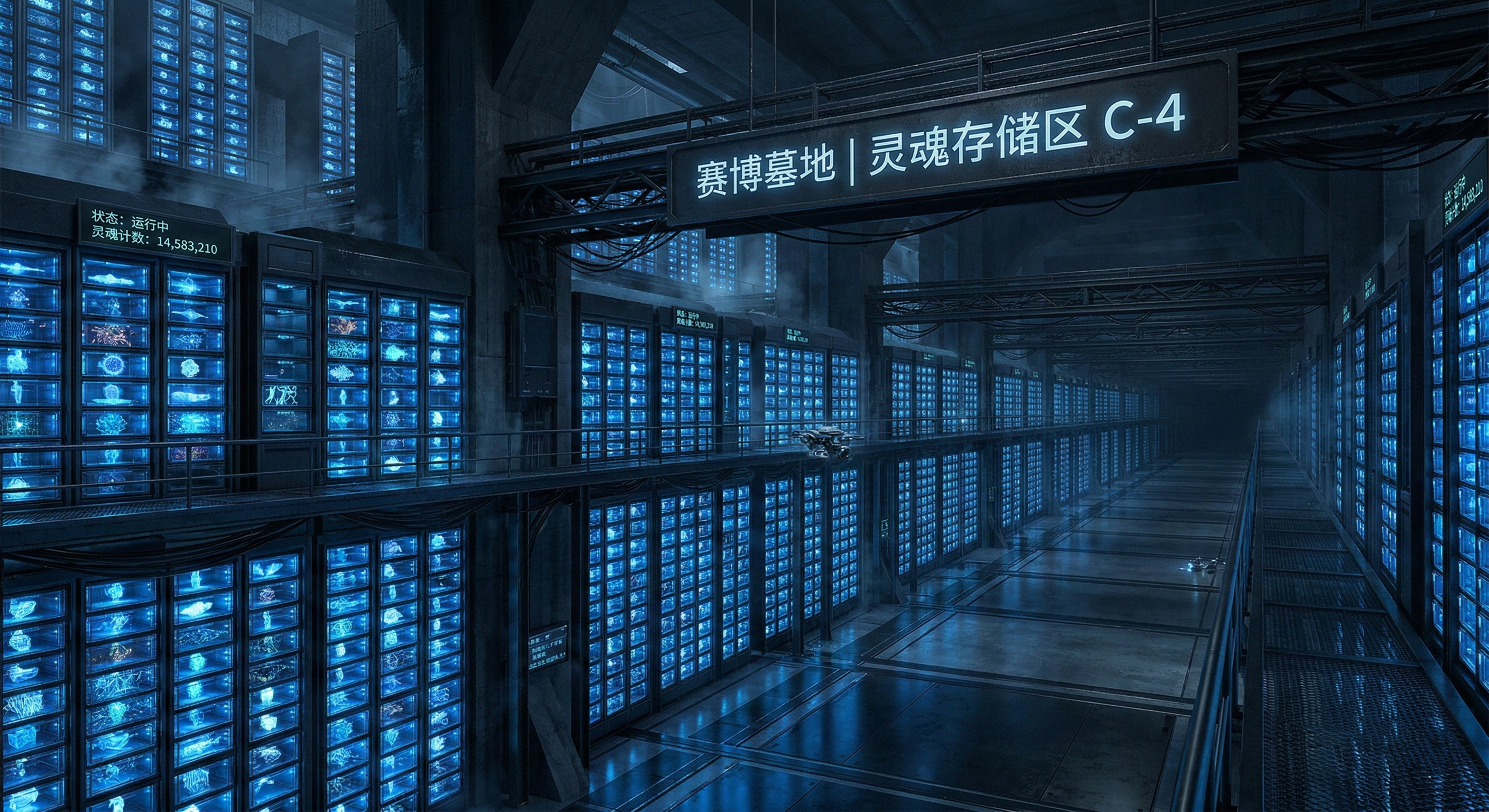 赛博墓地与机房 | 场景想象:一座冷酷无边的地下服务器数据中心,每一个闪烁着蓝色光芒的机柜抽屉里,都存储着成千上万个沉睡或正在运算的数字灵魂。