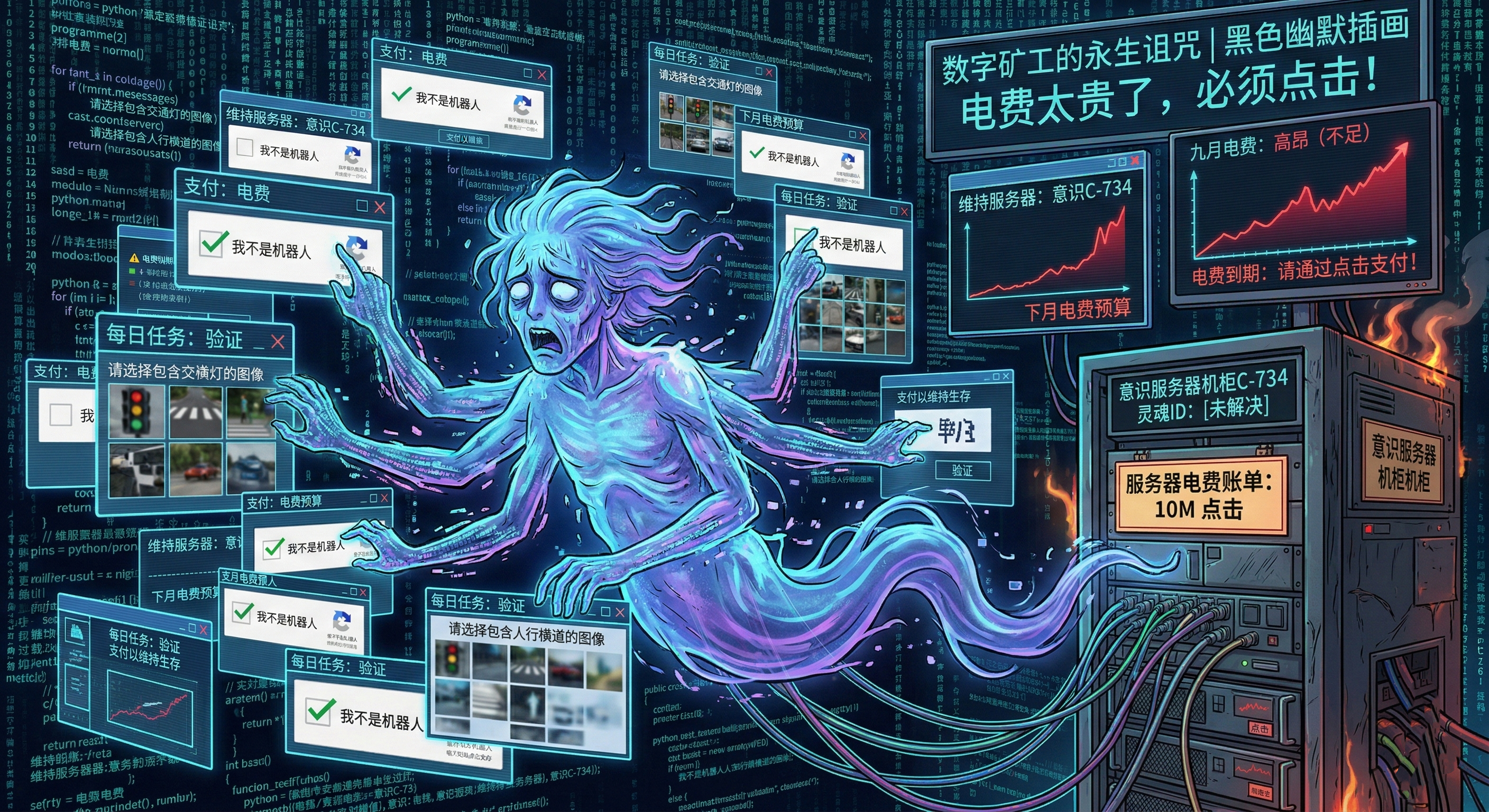 数字矿工的永生诅咒 | 黑色幽默插画:一个虚无的灵魂在一串串代码中疯狂点击着“我不是机器人”的验证码,用以支付它这颗意识服务器下个月的高昂电费。