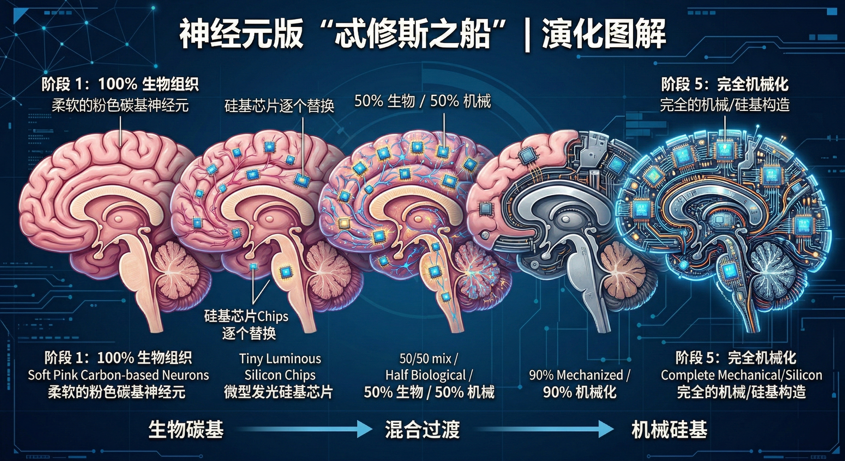 神经元版“忒修斯之船” | 演化图解:一张人类大脑的横截面,从左到右,柔软的粉色碳基神经元正在被微型的发光硅基芯片一颗颗替换,直至整个大脑变成完全的机械构造。