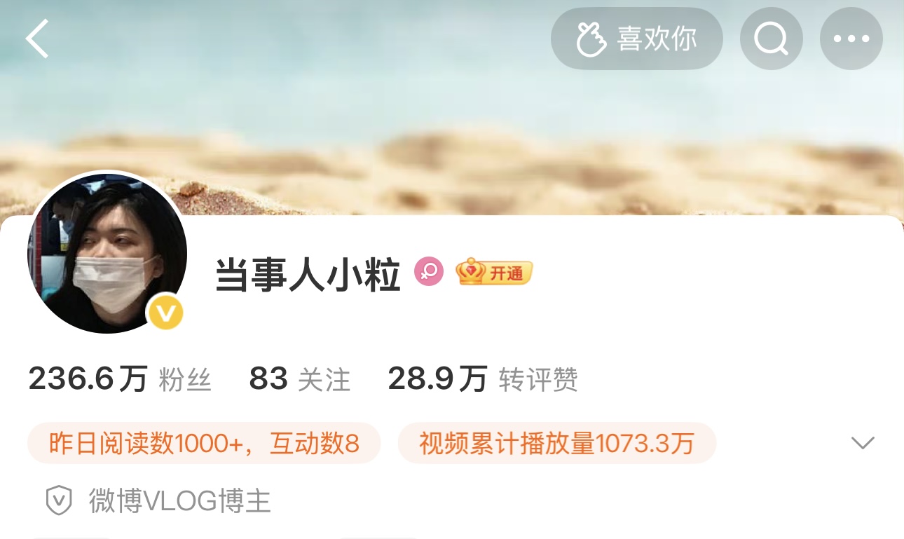 后来,浩然凭实力刷到了小粒的微博和B站账号,她竟然是一个搞笑博主,全网有几百万粉丝,然而她竟然完全不管也不怎么更新,就开启新的生活了。正常人怎么也会想着要利用这个流量做点什么吧?对吧?