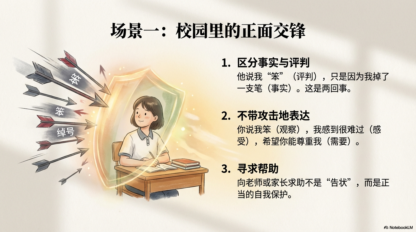 08:38 讲解线下校园言语暴力的应对方法,教孩子区分观察与评判、表达感受并及时寻求帮助
