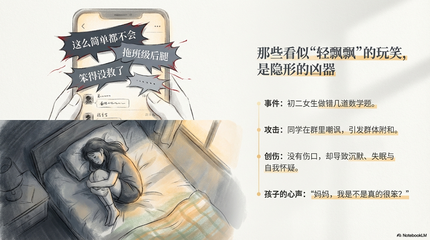 01:32 分享女儿初二被同学言语攻击的真实案例,点明言语暴力是隐形霸凌,会让孩子陷入深度自我怀疑