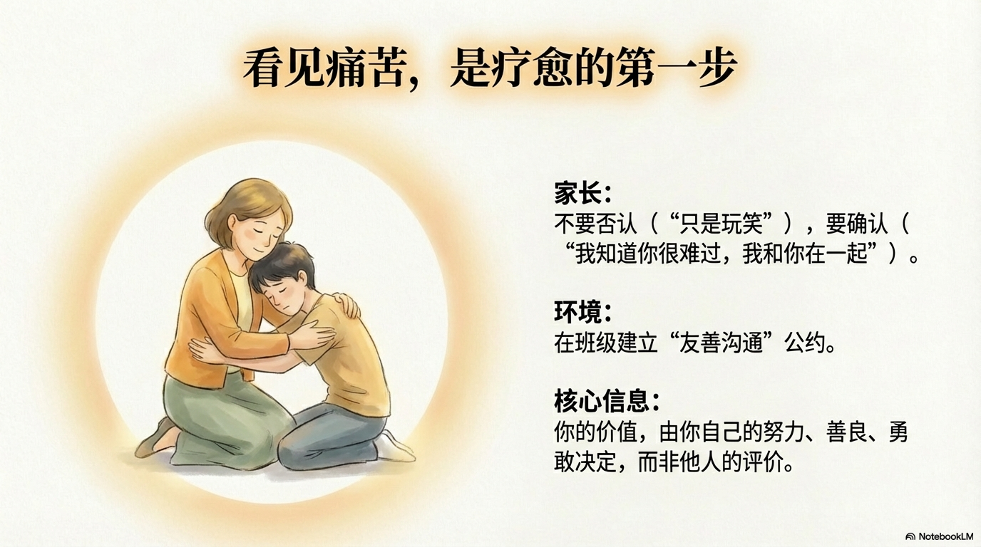 16:32 强调要重视言语暴力,给出家长看见孩子痛苦、家校共建友善环境的具体建议