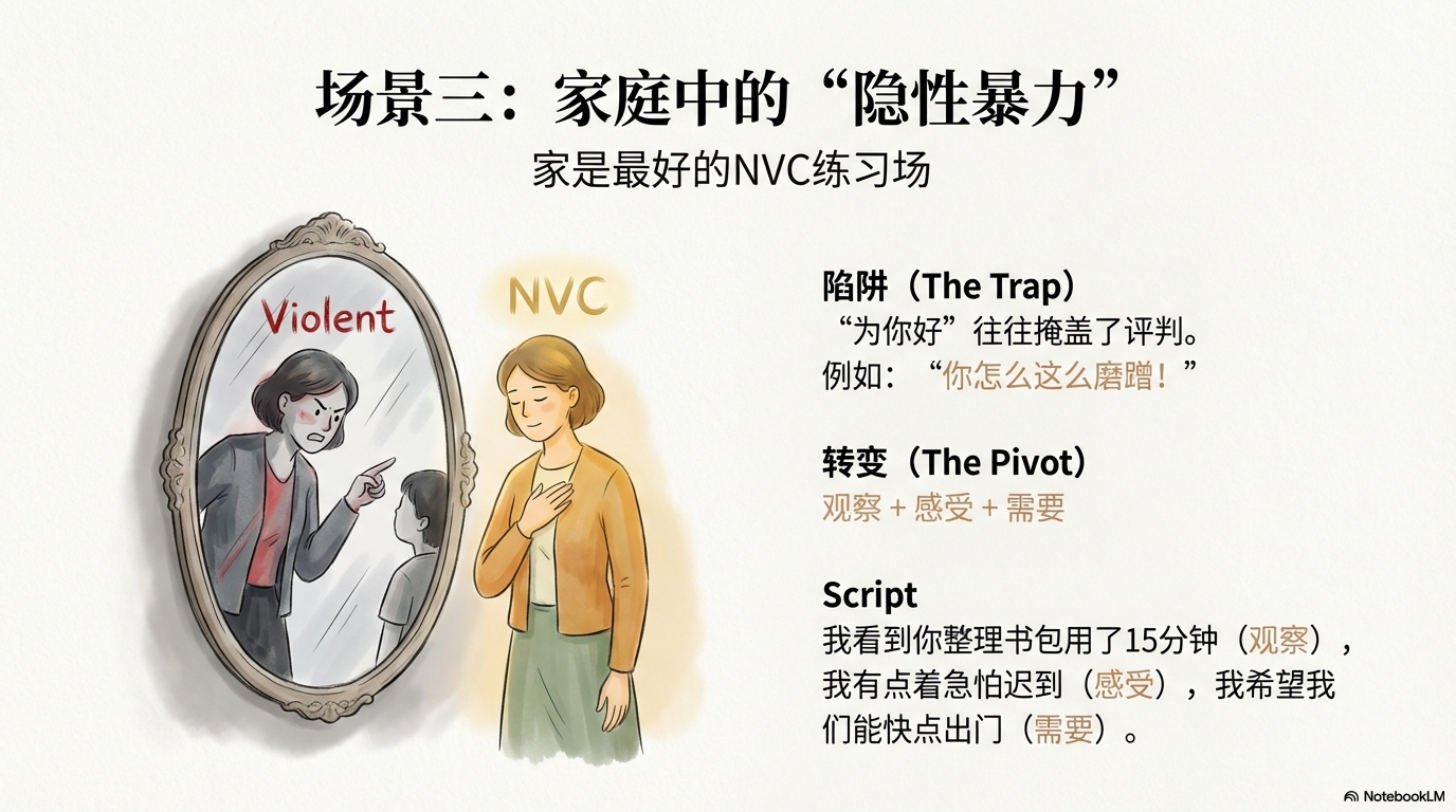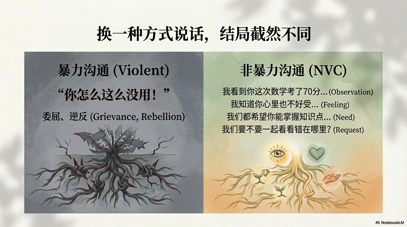12:55 指出家庭存在隐性言语暴力,分享用非暴力沟通改善亲子沟通的具体话术和做法