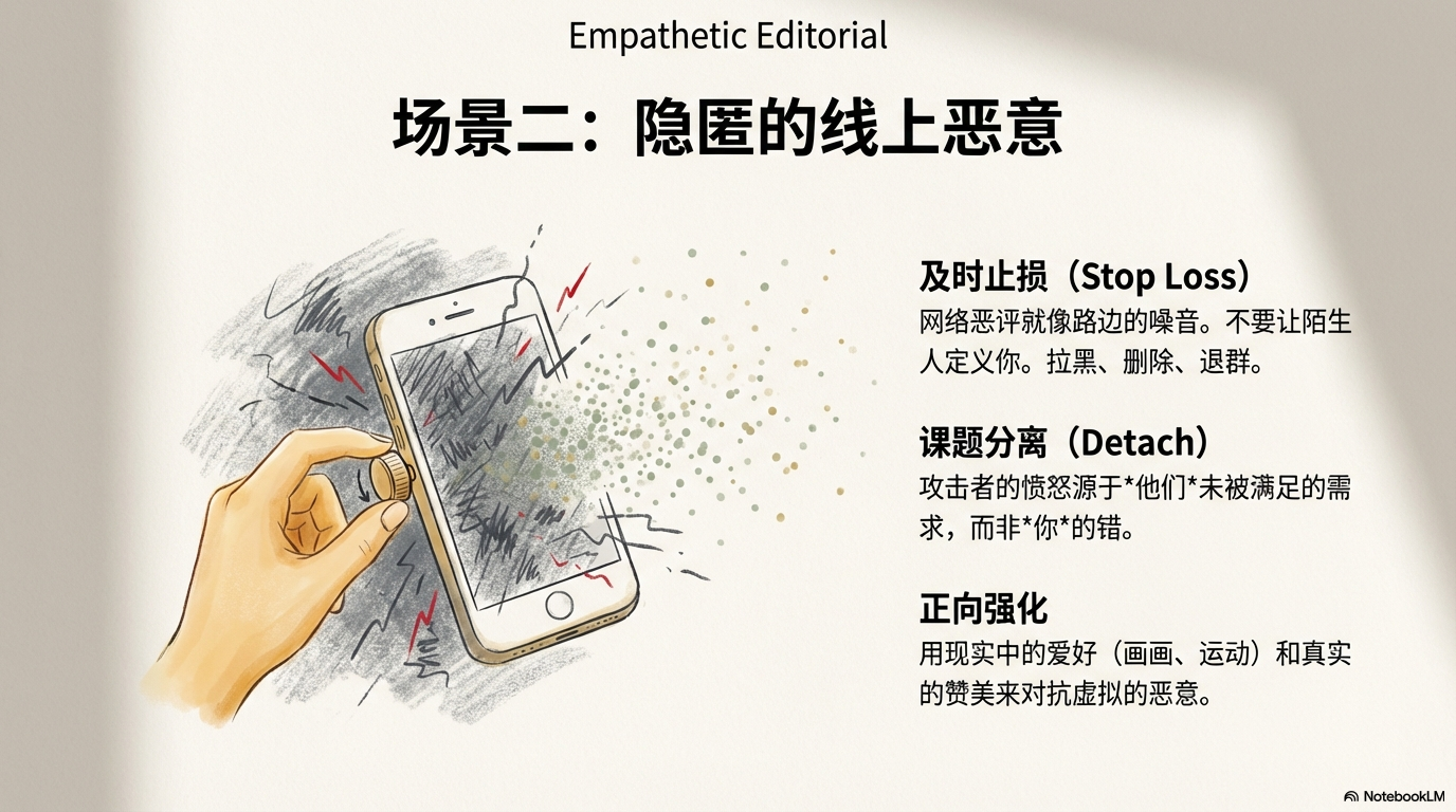 10:43 给出线上言语暴力的应对策略,包括及时止损、区分他人情绪与自我价值、正向回应重建自信