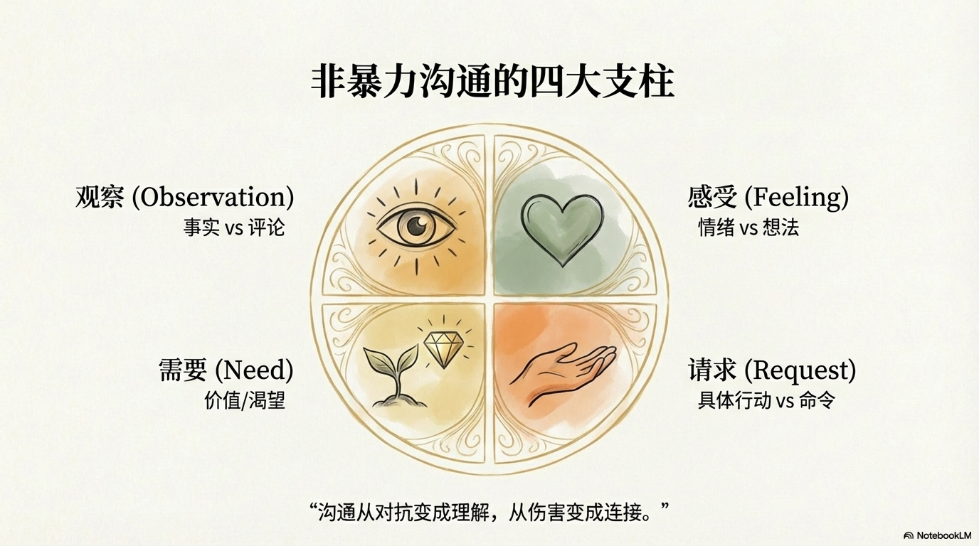 05:25 推荐《非暴力沟通》,解读言语暴力的本质是异化沟通,介绍书籍“观察、感受、需要、请求”的核心观点