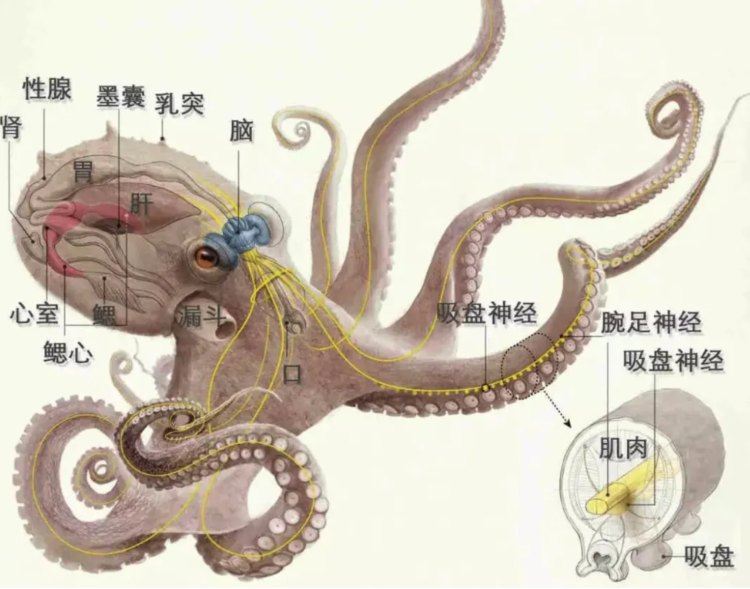 “甜甜圈大脑”是中央大脑,八只手臂各有神经细胞团(常被误称“九大脑”),手臂无需中央指挥即可自主抓握、尝味(吸盘带味觉)。