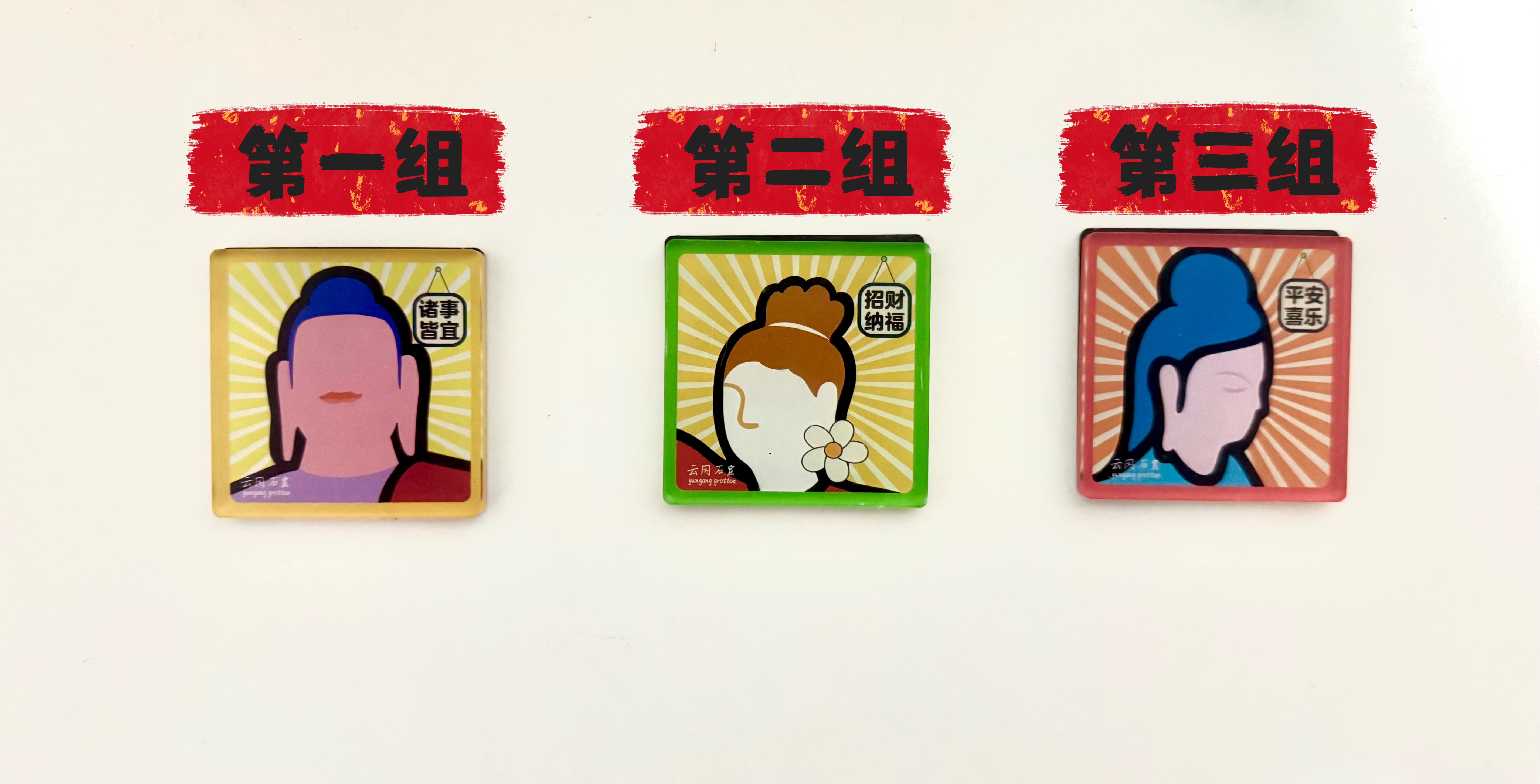 下方为三组冰箱贴指示物图片,分别为:诸事皆宜、招财纳福、平安喜乐