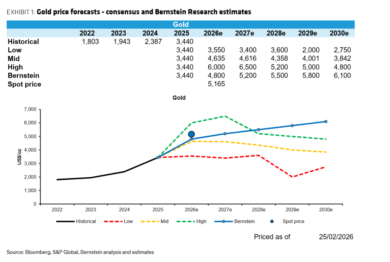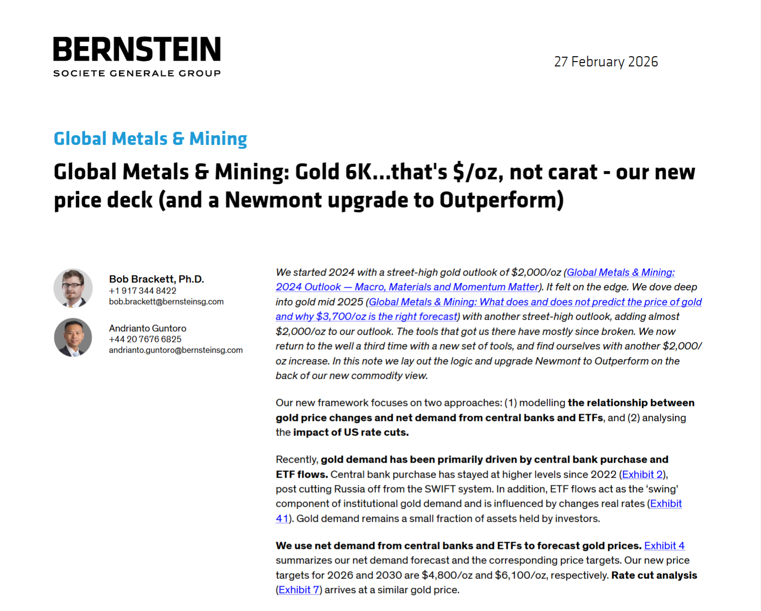 2026年2月27日,伯恩斯坦(Bernstein)发布《Global Metals & Mining: Gold 6K...that's $$/oz, not carat》研报,给出震撼预测:2026年黄金目标$$4800/oz,2030年直指$$6100/oz,同时将纽蒙特评级上调至“跑赢大盘”,目标$$157/股。