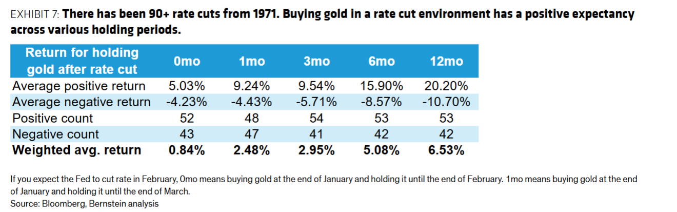 Exhibit 7(研报第11页):90+次降息周期数据统计,显示每次降息后12个月,金价平均上涨6.53%,结合2026年市场预期2-3次降息,测算将为金价带来13%-19.5%的潜在涨幅。