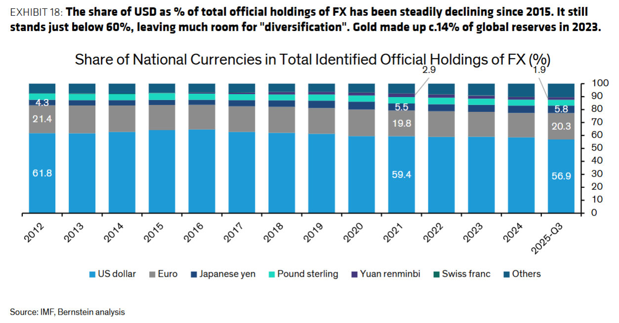 Exhibit 18(研报第17页):2012-2025Q3全球外汇储备货币占比趋势图,美元占比从61.8%持续下滑至56.9%,而黄金2023年已占全球储备的14%,去美元化趋势为金价提供长期支撑。