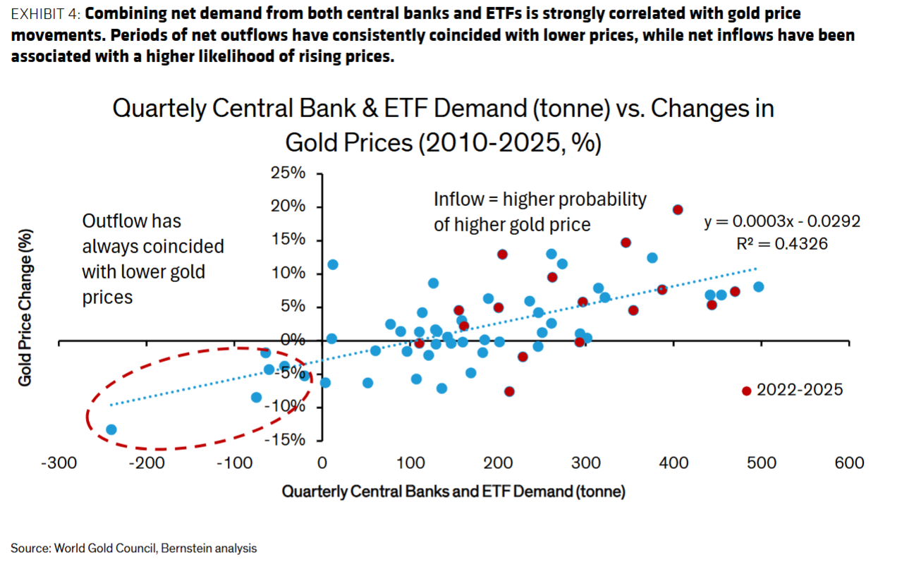 Exhibit 4(研报第8页):2010-2025年央行+ETF季度净需求与金价变动散点图,呈现明确正相关(R²=0.4326),直观证明净需求 inflow 时金价上涨概率显著提升,outflow 则必伴随金价下跌。