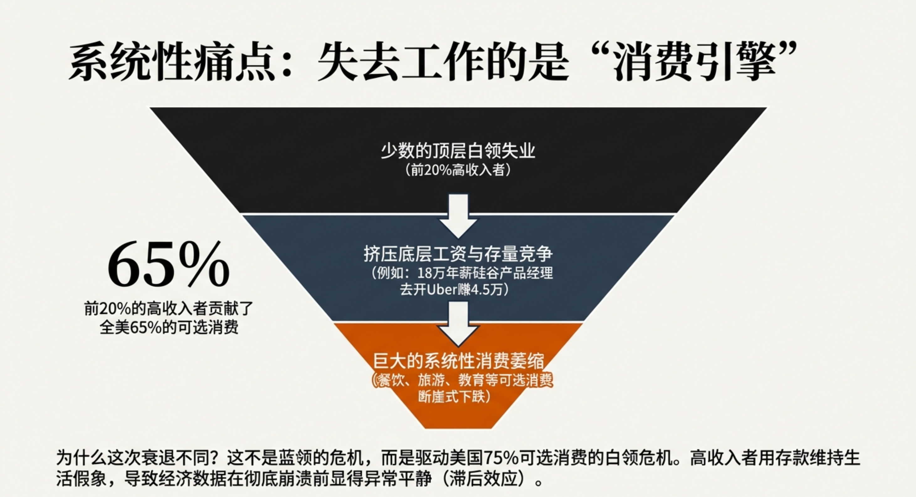 - 劳动力层:被取代的白领被迫转向低薪服务业,导致整体工资水平被压低(工资压缩),消费能力进一步萎缩。