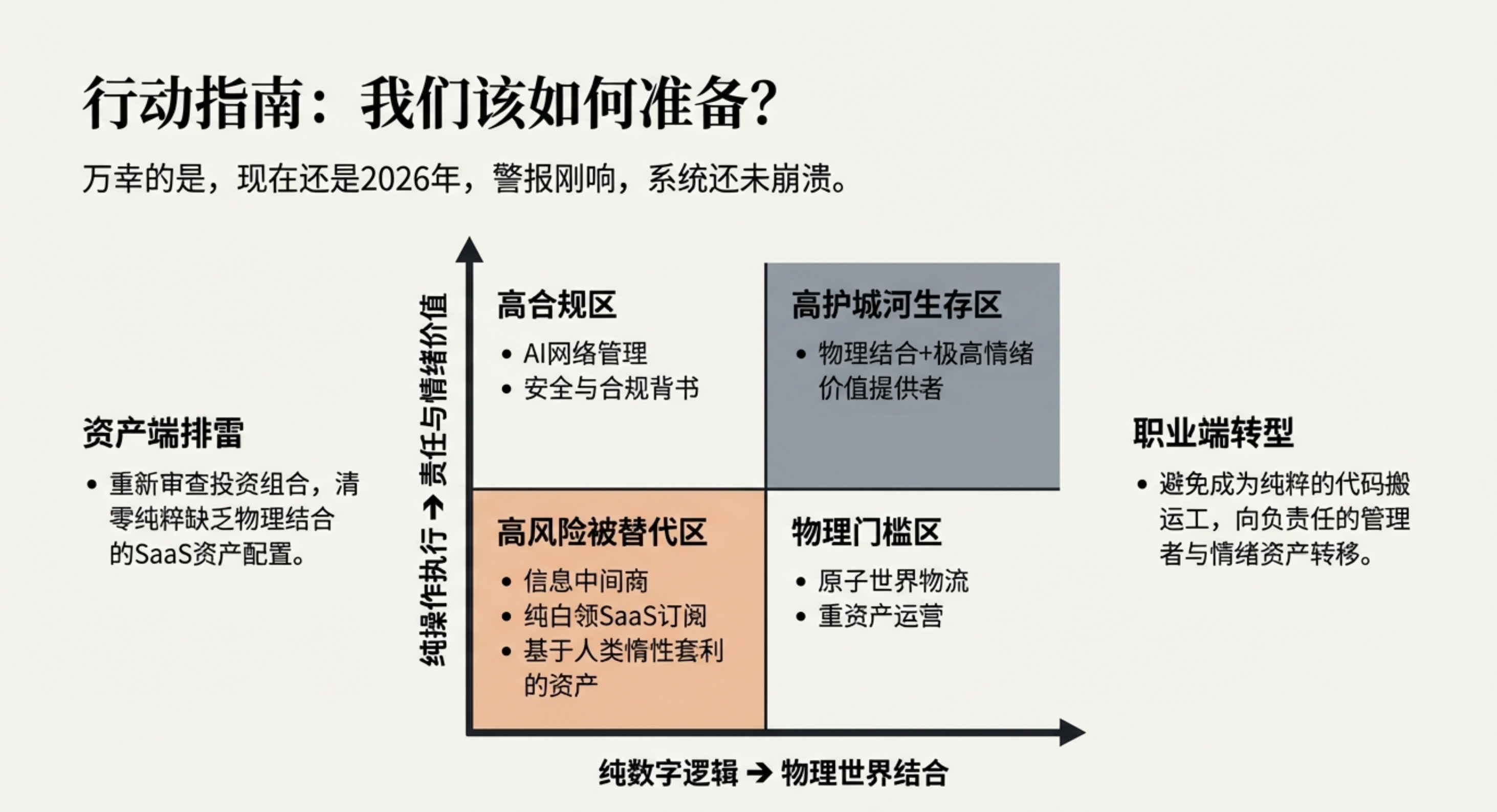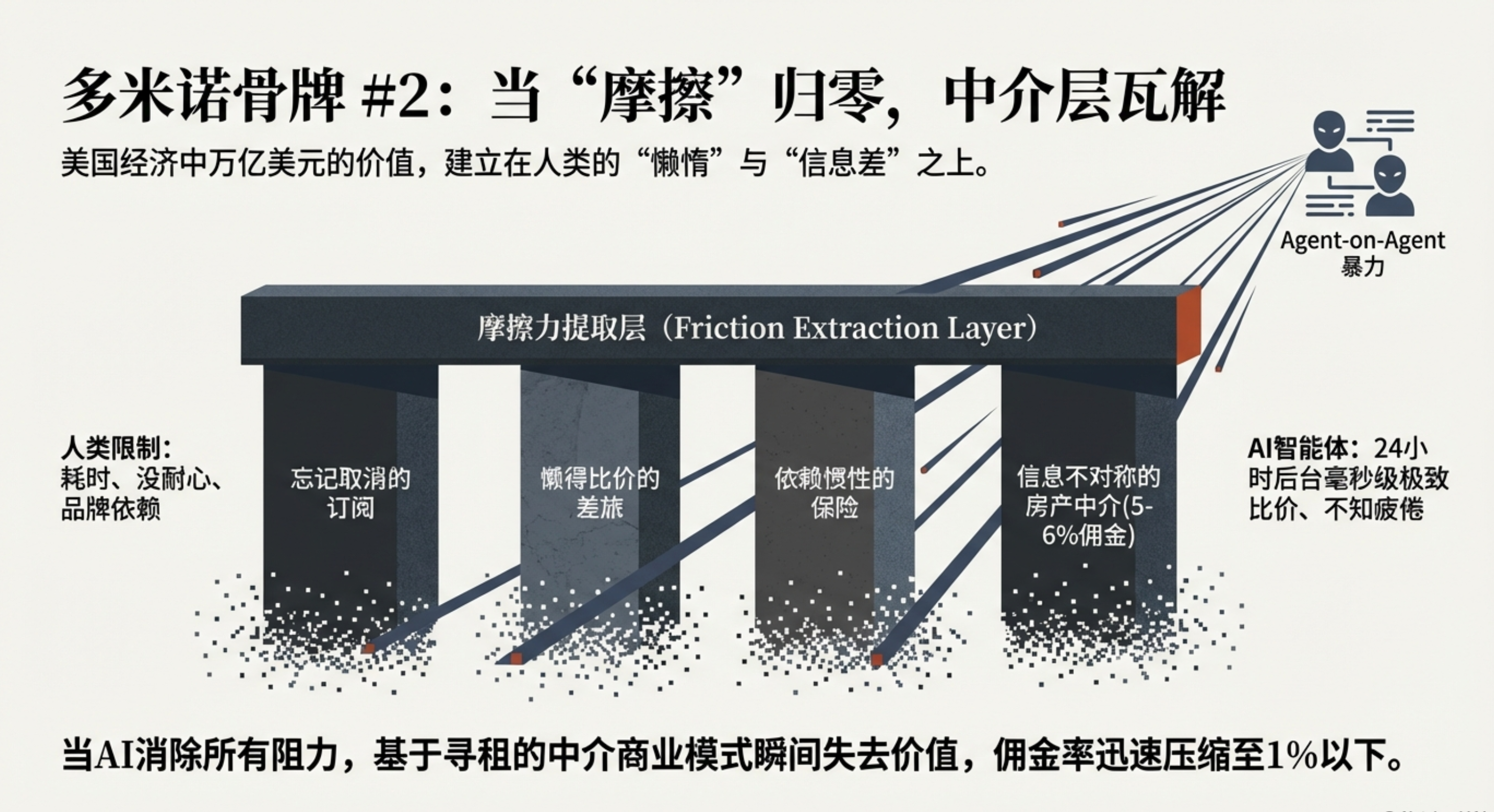 - 专业服务消失:任何靠“帮助客户导航复杂性”获利的行业——保险续约、税务筹划、房产中介、法律文书——都将被 AI 代理取代。