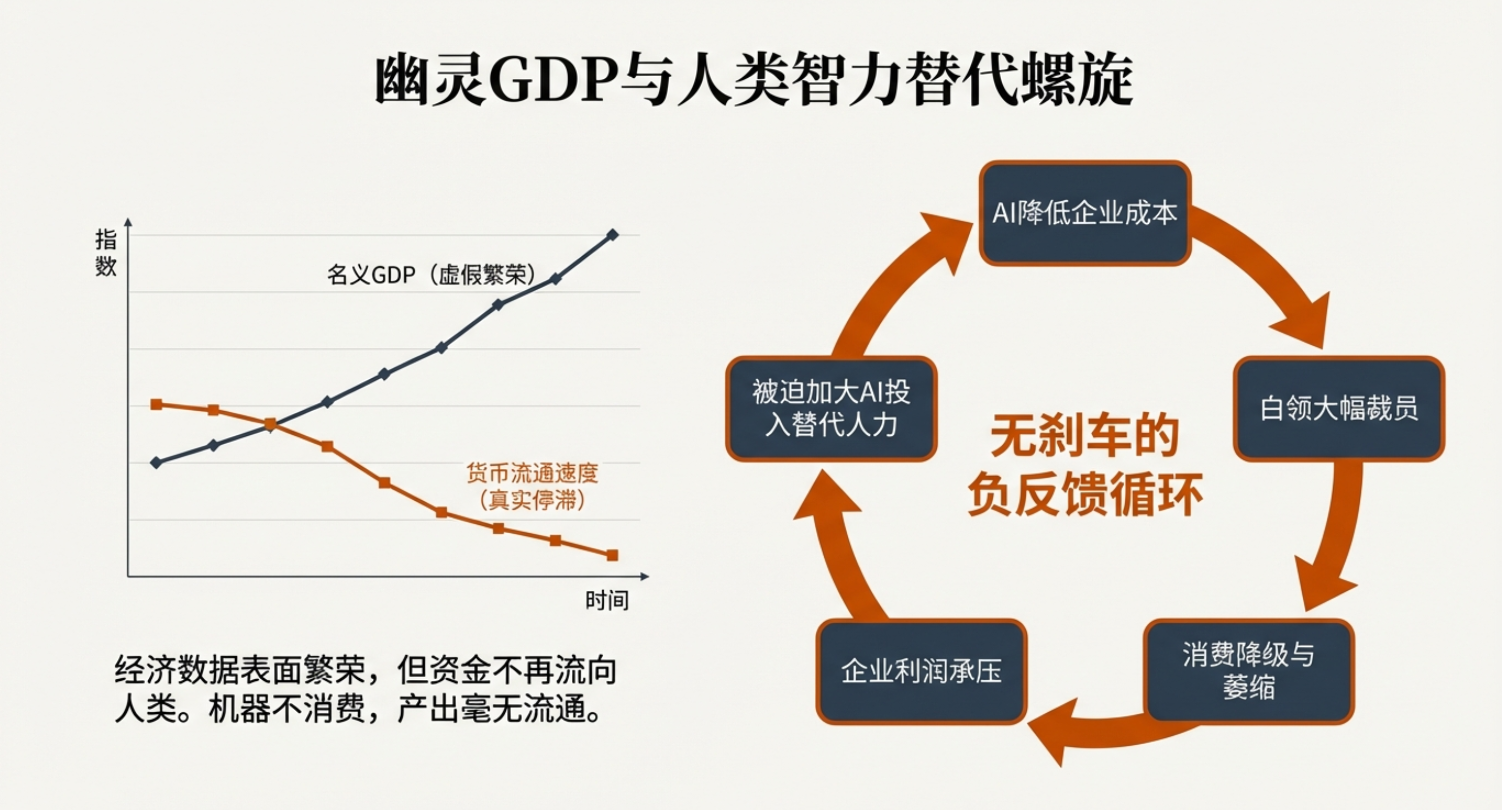 - “幽灵 GDP”:AI驱动的机器可以产出巨大的经济价值(如软件、服务),但这些产值(所谓的“幽灵 GDP”)并不流向消费市场。机器不消费,导致货币流通速度下降,而占 GDP 高达70%的人类消费经济,却因大规模失业而枯竭。