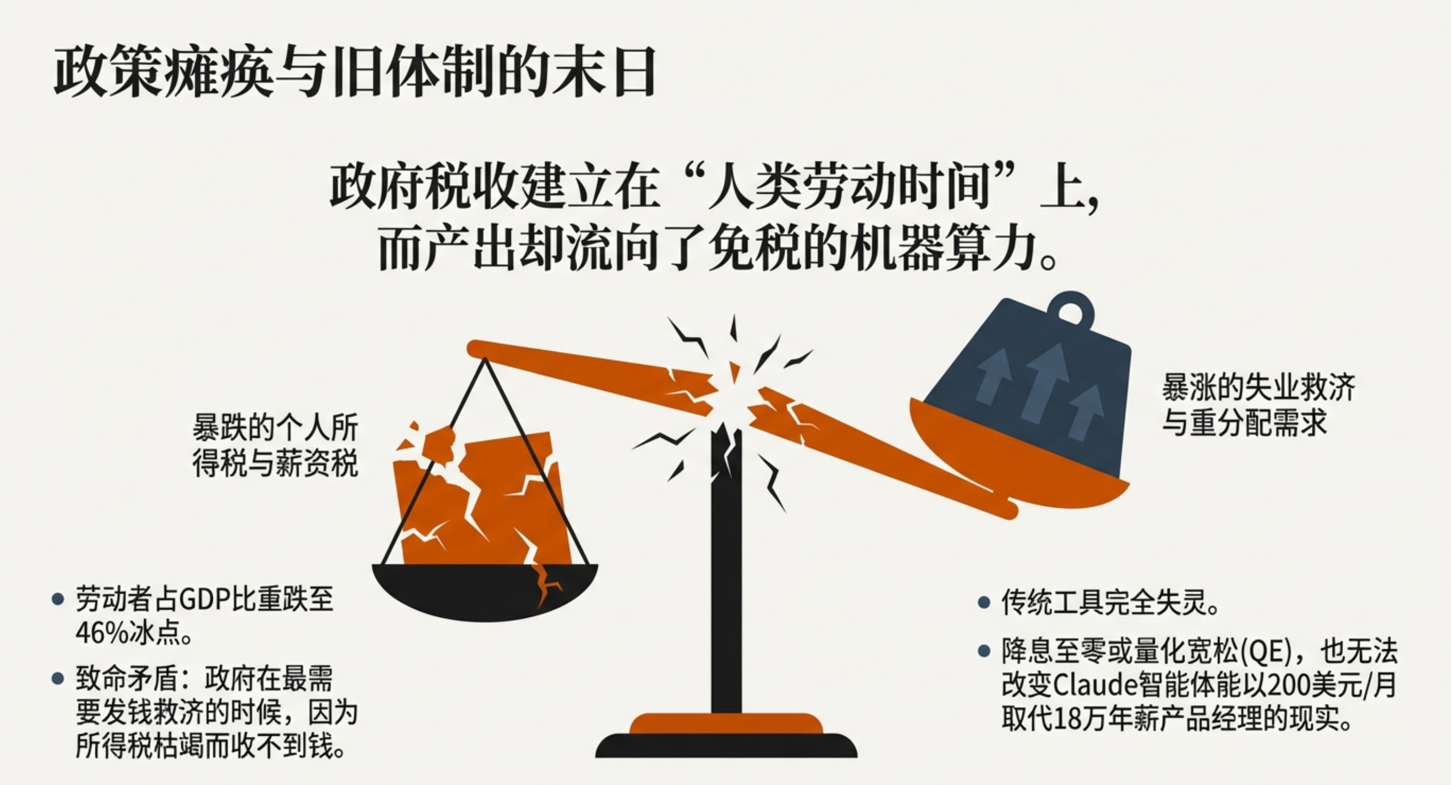 - 税收枯竭:现行税制高度依赖对人类劳动征收的所得税和薪资税。当劳动力份额骤降,政府收入急剧缩水,难以支撑社会救助和公共服务。