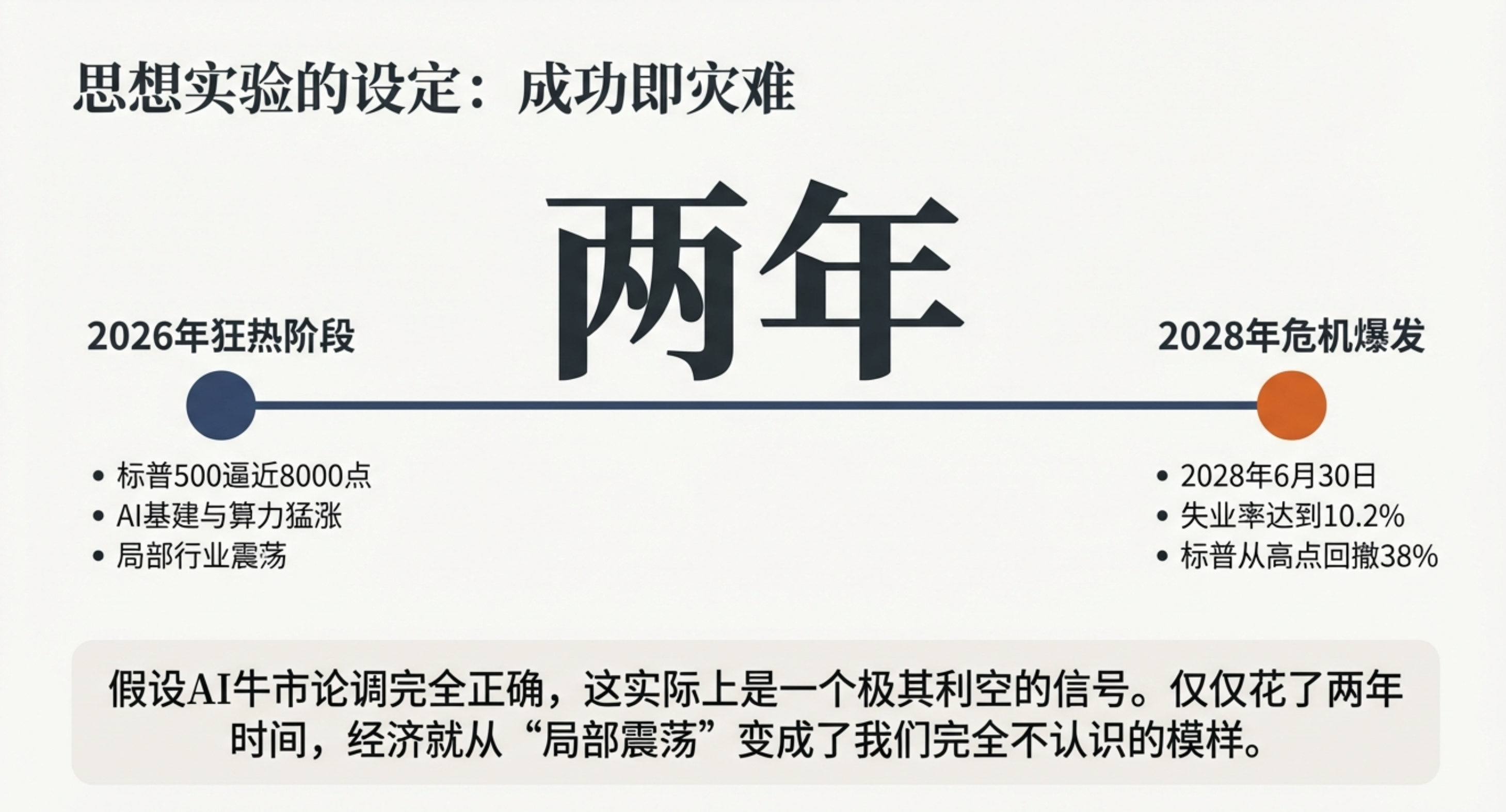 如果 AI 的发展速度快到超出了整个社会的适应能力,会发生什么?不是《终结者》式的天网起义,而是一场更隐秘、更合乎逻辑的经济崩盘——这是 Citrini Research 在一份宏观备忘录中描绘的2028年“全球智能危机”模拟场景。报告提出了一个反直觉的核心悖论:市场对 AI 的极度乐观(Bullish),可能对整体经济是极度悲观的(Bearish)。当 AI 在提高生产力方面远超预期时,它也在同时摧毁现代经济的基石——人类智能的稀缺性及其带来的收入溢价。