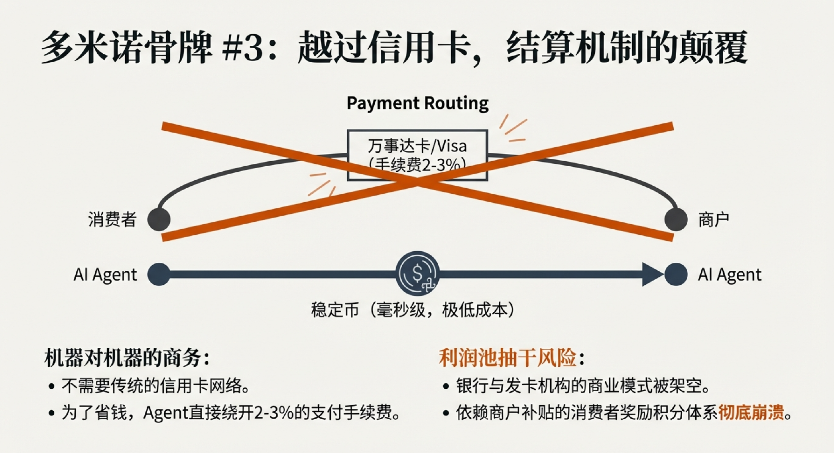 - 去通道化:为了极致效率,AI 代理会绕过 Visa、Mastercard 等传统支付网络,选择低成本的稳定币交易,直接威胁金融支付巨头的营收模式。