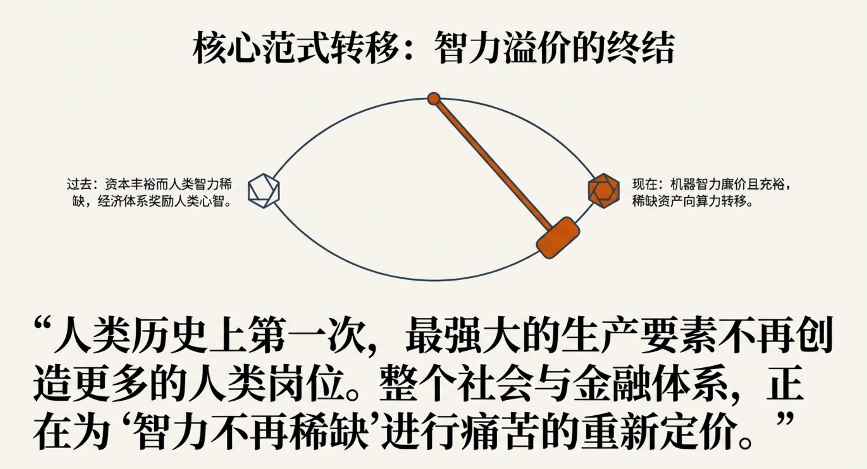 - 稀缺性的消失:现代经济(特别是发达国家的消费驱动型经济)建立在“人类智能的稀缺性”之上。白领阶层的收入溢价,是消费能力、抵押贷款偿付能力和税收的主要来源。当 AI 让这种稀缺性一夜消失,支撑经济的支柱便开始动摇。