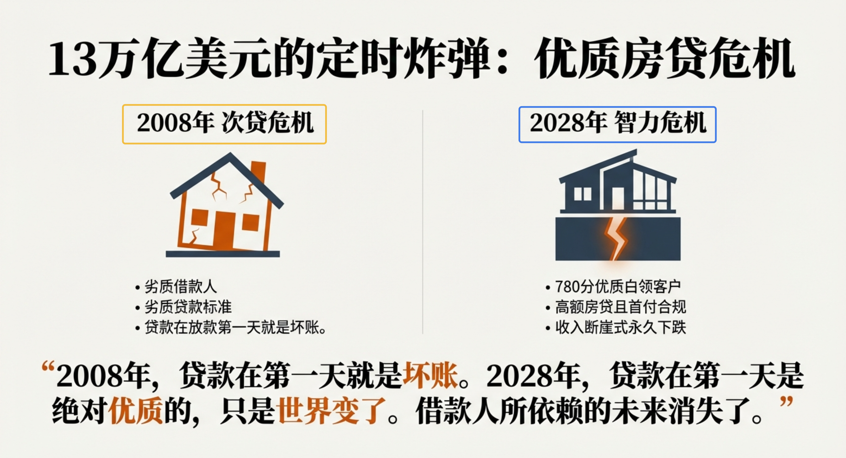 - 住房抵押贷款危机:这是最致命的一环。13万亿美元的住房抵押贷款市场面临威胁。借款人最初是信用极佳的白领,但当他们的职业被 AI 永久取代后,收入无法支撑30年贷款,将引发比2008年更难处理的、涉及优质借款人的违约潮。