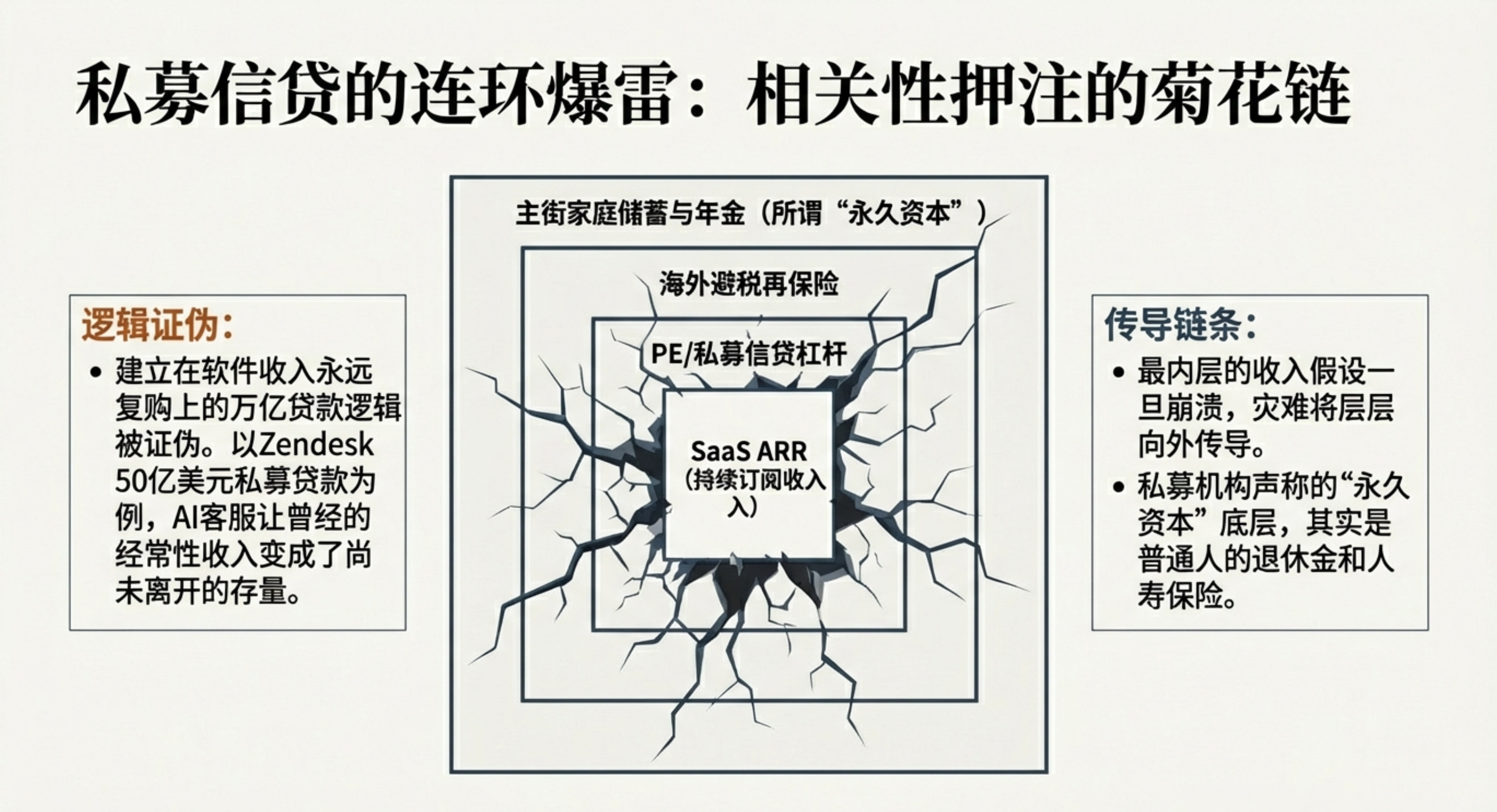 - 保险与年金危机:大型资产管理公司(如 Apollo、KKR)使用人寿保险资金投资于上述私有信贷。一旦信贷资产恶化,将直接威胁普通民众的养老金安全。