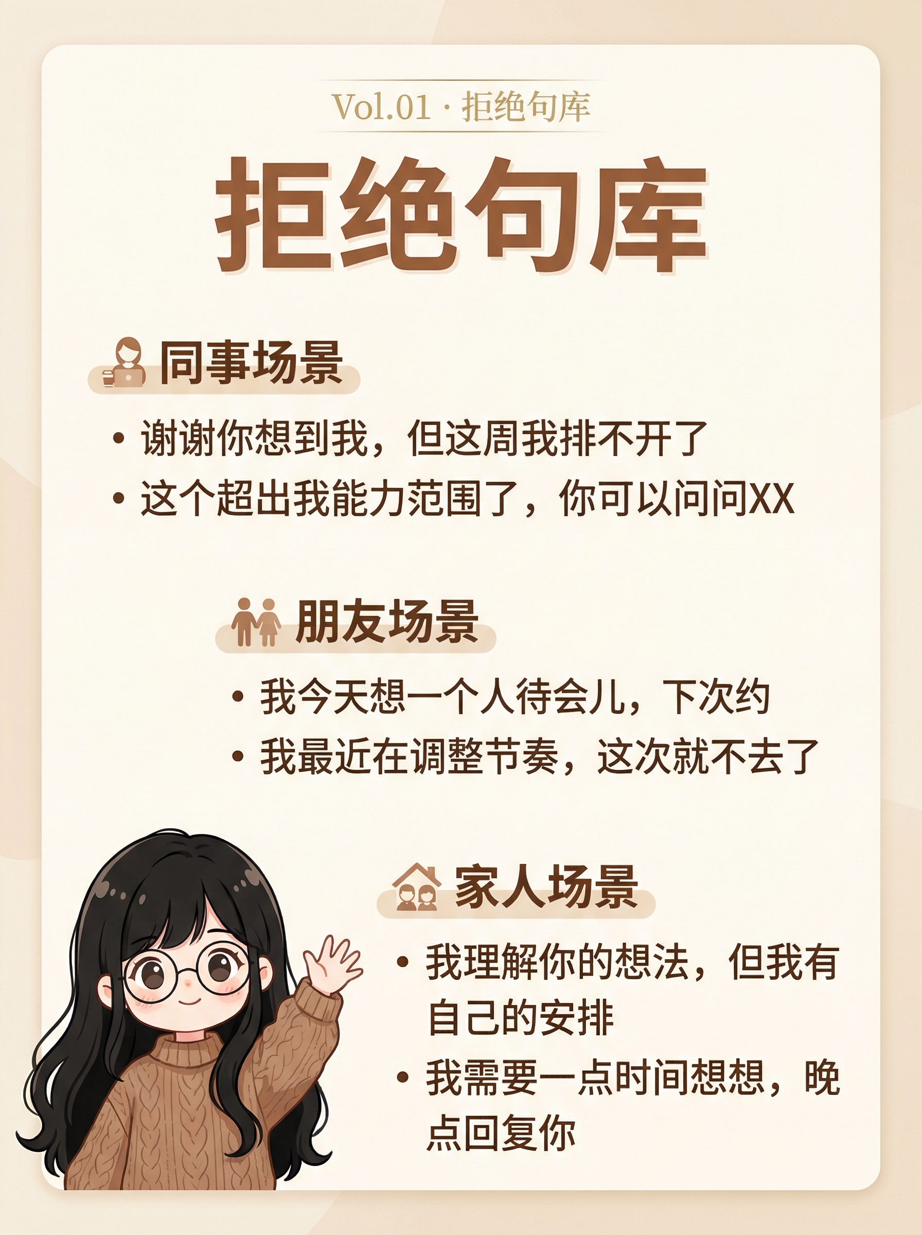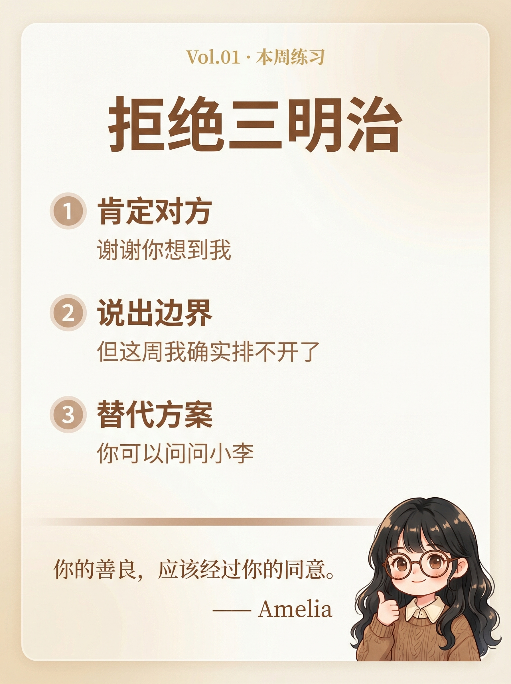 但那是他的课题。你这周的任务是:用一次。只用一次就行。拒绝一件小事——一个不想参加的聚餐、一个不想接的活、一条不想秒回的消息。用完之后,你可能会心跳加速、会有点内疚。那是正常的。那是你身体在重新学一件它从来没学过的事——"我可以说不,而天不会塌。"好,这是我们的第一期。