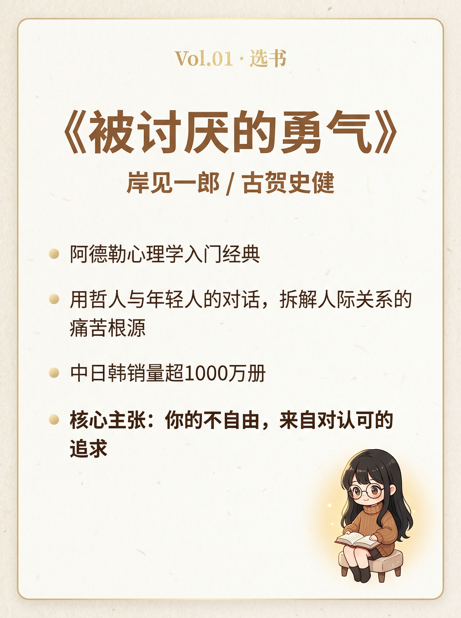 "这本书用一个哲人和一个年轻人的对话写成,读起来像吵架,但吵着吵着你会被击中。它在中日韩加起来卖了超过一千万册,不是因为它鸡血,而是因为它讲了一些听上去很残忍、但想通了会松一口气的真话。