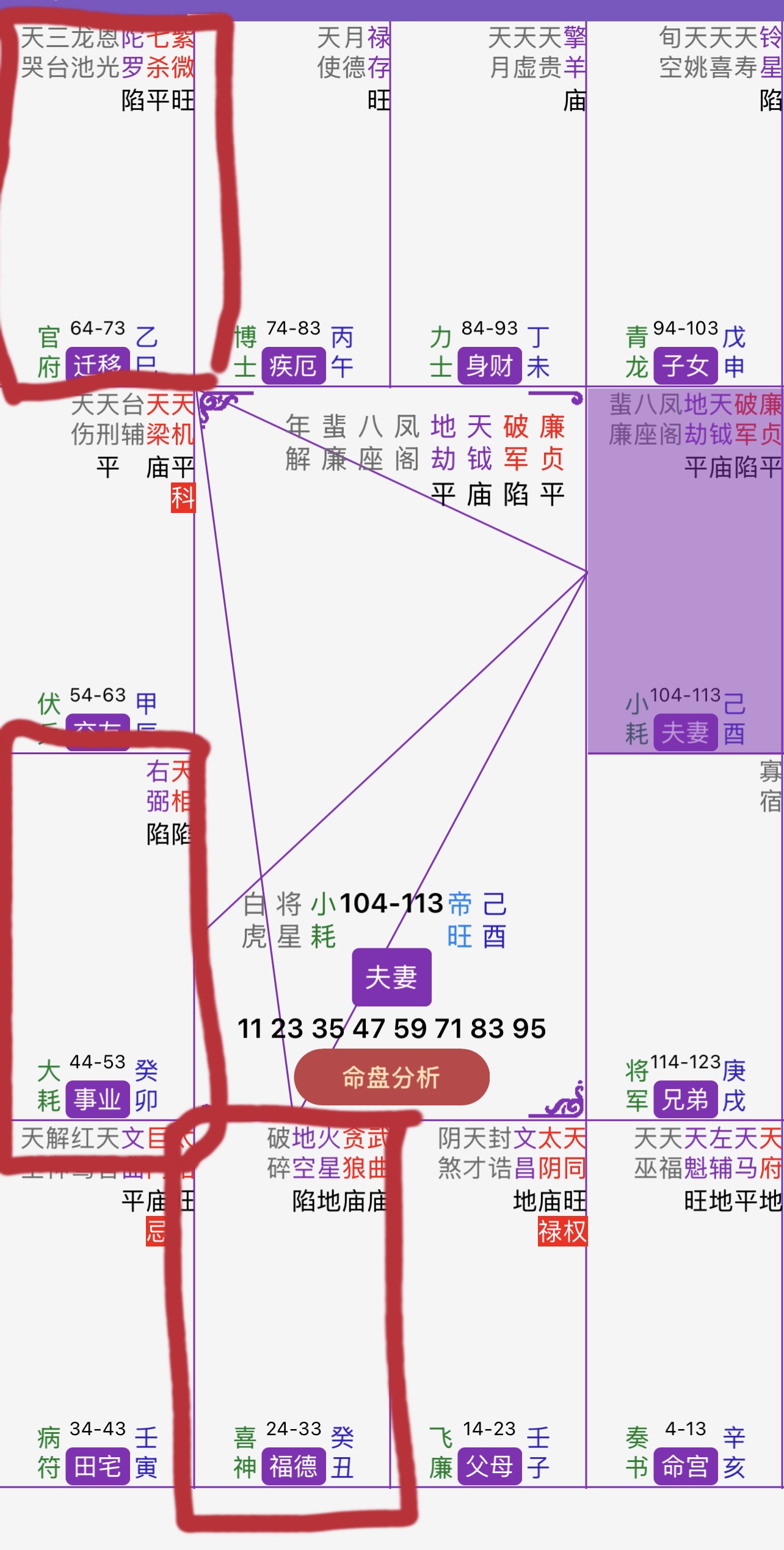 1. 紫微斗数命盘:“夫妻宫”、“迁移宫”、“福德宫”位置示意图: