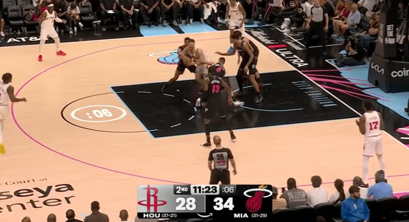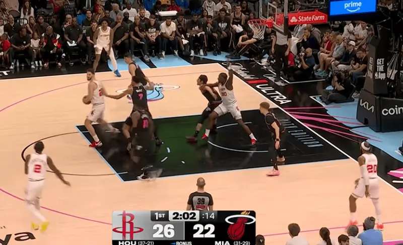 首节5:08,热火上维尔后摆出区域联防,刚刚与希罗争吵后的KD,手起刀落命中三分,结果回头,伊森卡皇就因对位不明确,让韦尔弧顶空位三分命中。乌度卡在暂停过程中与伊森爆发了争吵,这个我们后面再谈。热火随后摆出1-3-1联防,同样是喜欢联防的球队,但热火的联防是动态的,有变化的,随着对手的不同而选择不同的防守方式,有的放矢,火箭依靠KD的个人能力苦苦支撑。