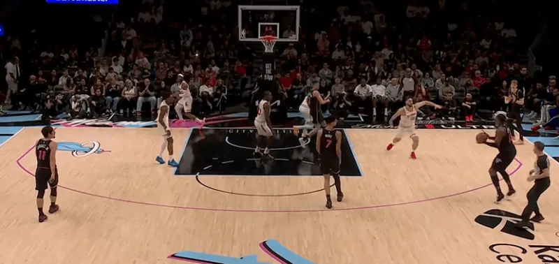 2:03,看下乌度卡摆出的恐怖五拒投阵容,卡佩拉、申京、阿门、奥科吉、芬妮史密斯,阿门底角三分不中,哈克斯篮下轻取两分,卡佩拉面对韦尔勾手不中,阿德巴约三分命中,奥科吉底角三分不中,哈克斯转换面对卡佩拉上篮反超比分。这两张图的空间,不言自明。