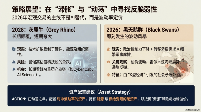 1.特殊时代背景:2028全球智能危机短期无需恐慌,但AI带来的滞胀和财富再分配是现实问题;AI耐心资本耗尽,市场对资本开支容忍度下降,特朗普政治控制力减弱,为转移矛盾引发的地缘冲突又进一步放大了全球不确定性,最终让2026年成为滞胀加剧、矛盾对立凸显、地缘和风险溢价上升的波动之年。