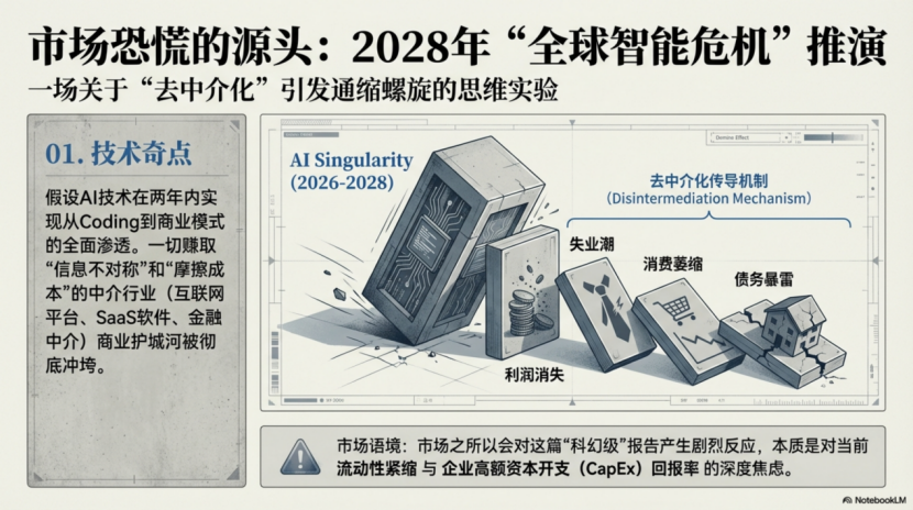 1.“AI智能危机”内容:Citrini research假设两年内AI快速颠覆中介类行业(互联网平台、金融、房产中介等),冲垮靠信息垄断、赚摩擦成本的商业模式,引发大规模失业、消费萎缩、债务爆雷,最终酿成2000年科网泡沫与2008年金融危机结合的全球危机。该内容得以快速传播,反映了市场对经济基本面和流动性的深度担忧。