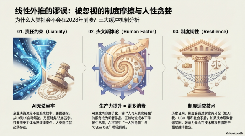 2.“AI智能危机”的主观性:时间设定过短,且忽视了多重约束与进化:技术本身的约束、企业与社会的采纳节奏、社会制度的进化韧性、技术的本质是辅助而非替代。