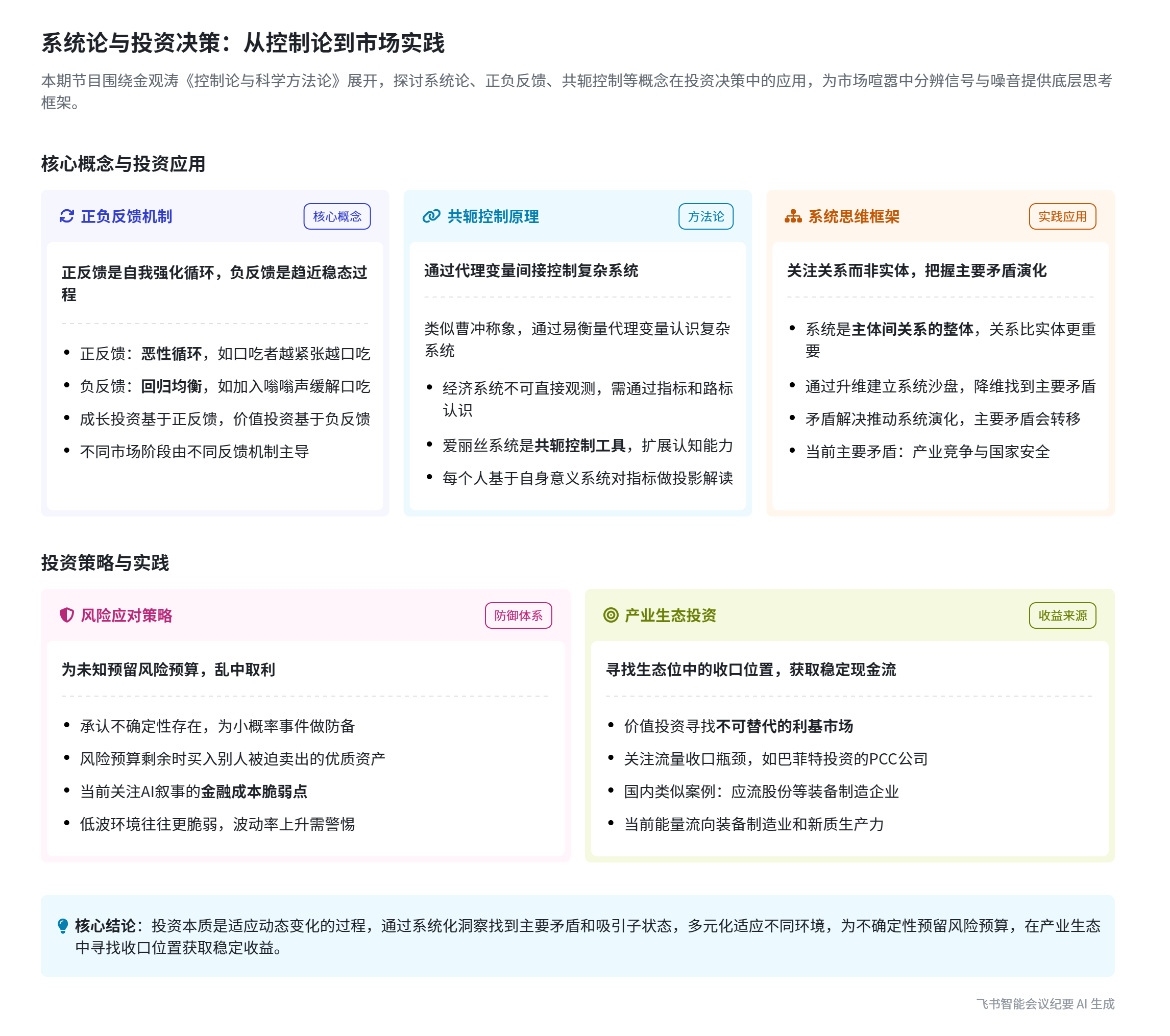 - 投资映射:成长投资(如科技股)依赖于正反馈循环,即技术或商业模式能不断放大自身效应,实现边际收益递增。价值投资则基于负反馈,寻找价格会向内在价值(稳态)回归的机会,强调均值回归。