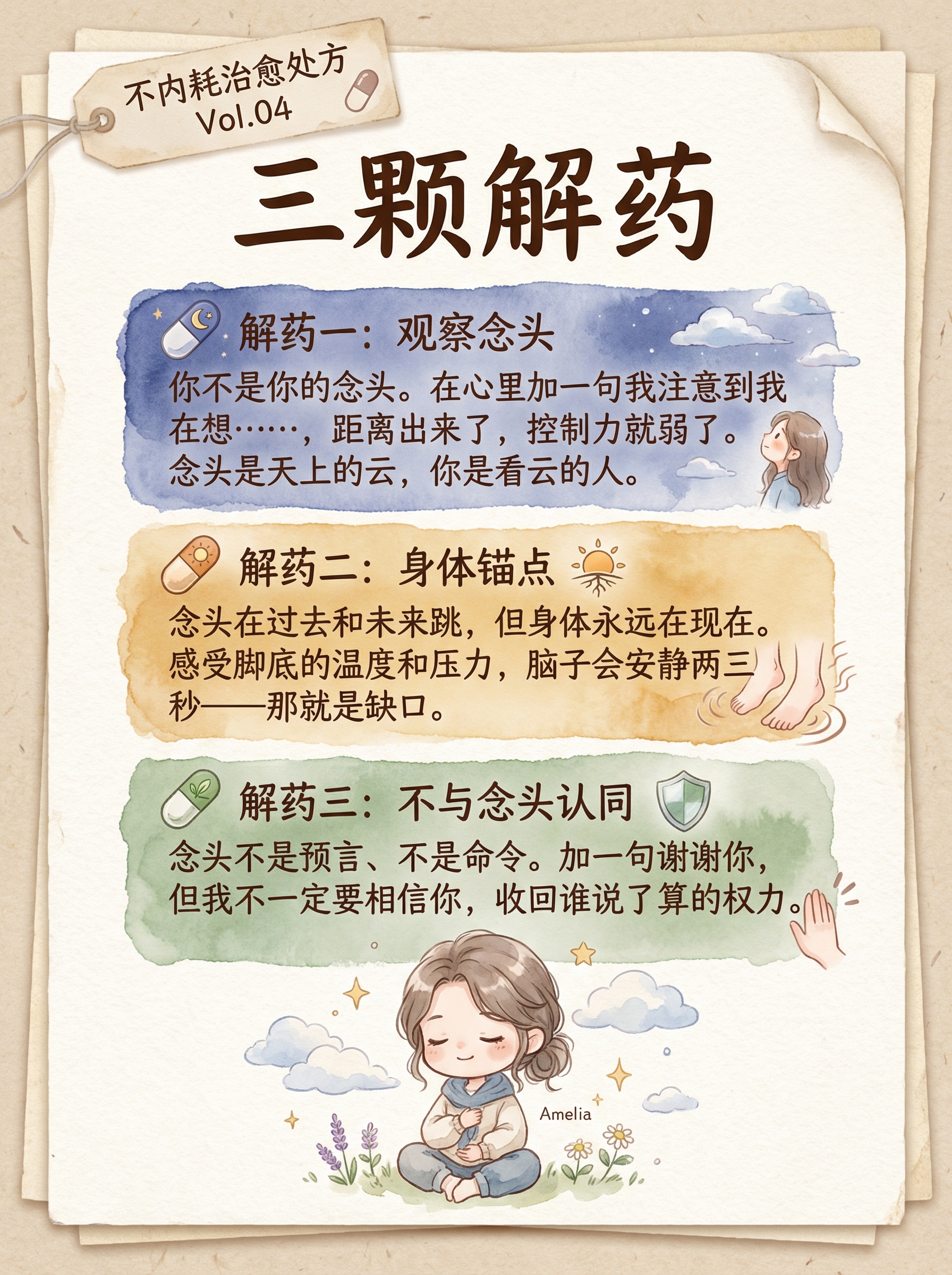 今天说错的那句话、明天要交的东西、上周那件没处理好的事、三年前的一个尴尬瞬间。你不是在想,是脑子自己在想。你越想停下来,它转得越快。
