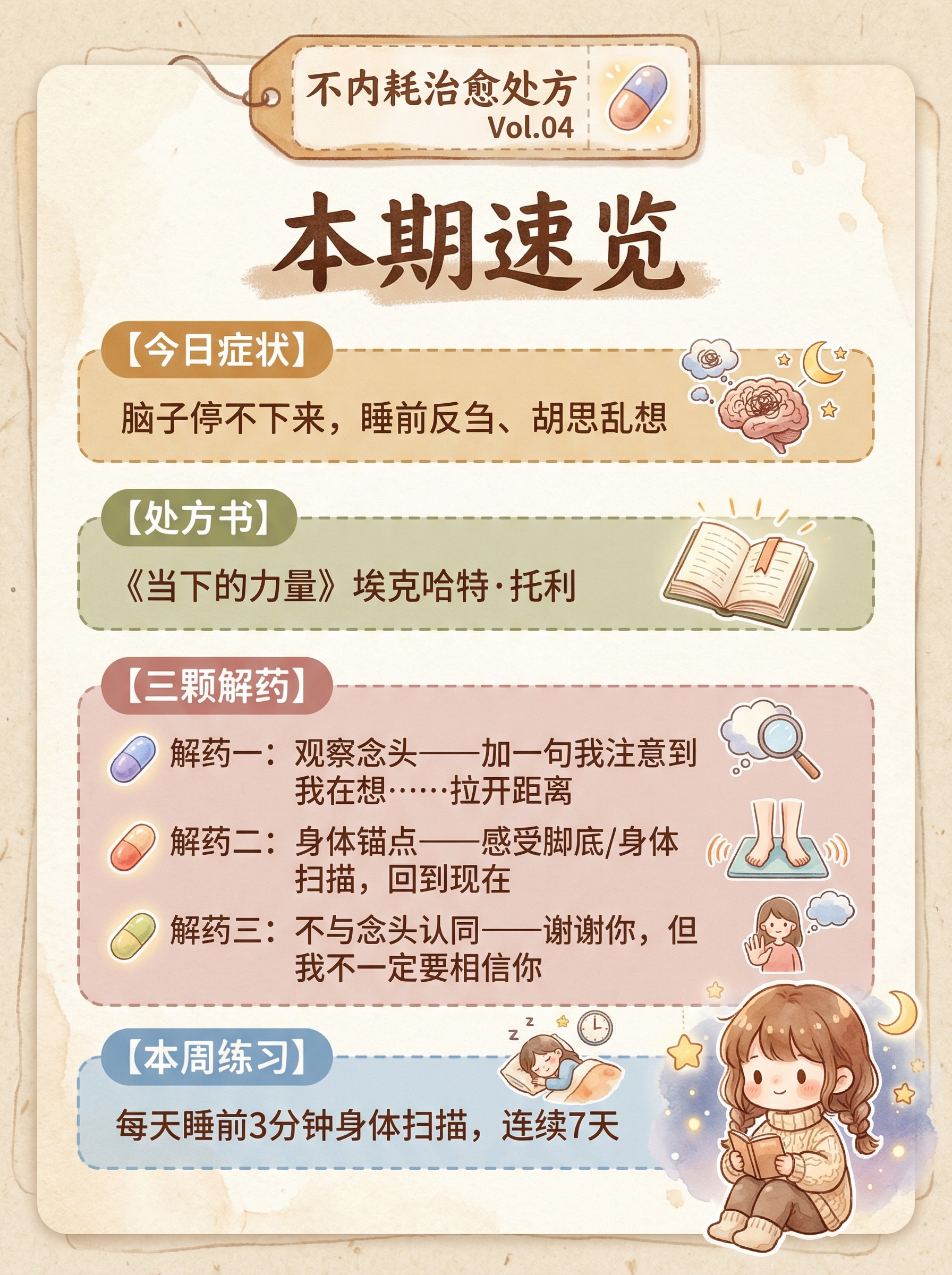 今天我们要解决的问题是:脑子停不下来,尤其是睡前,我怎么把自己拉回"现在"?