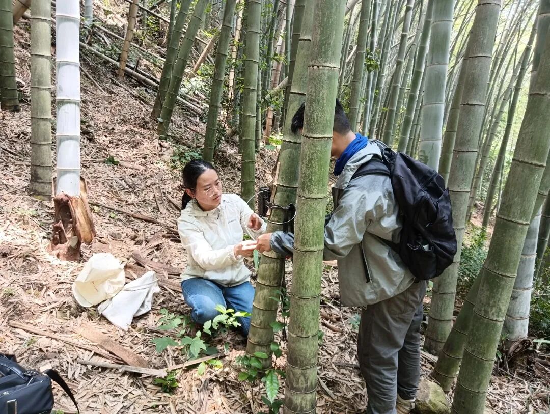 沈秋和同事在野外安装野生动物监测红外相机