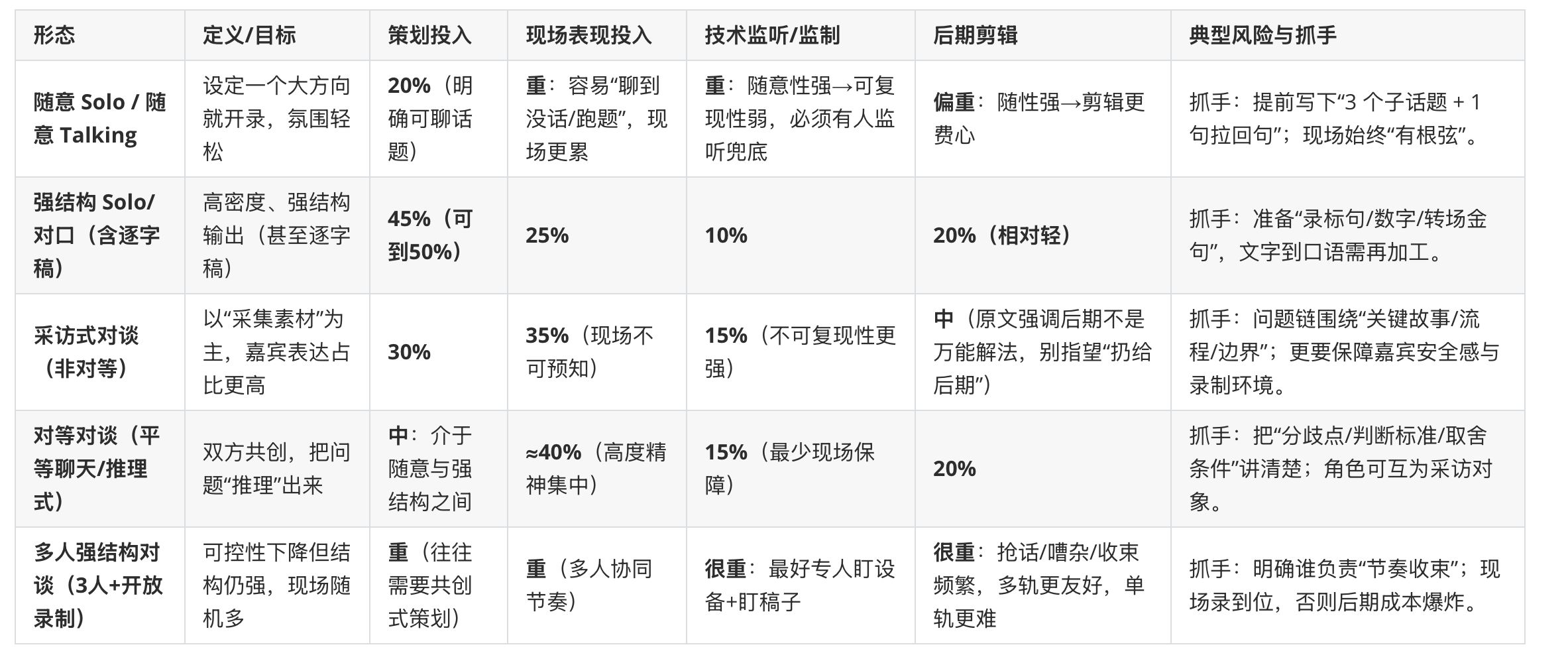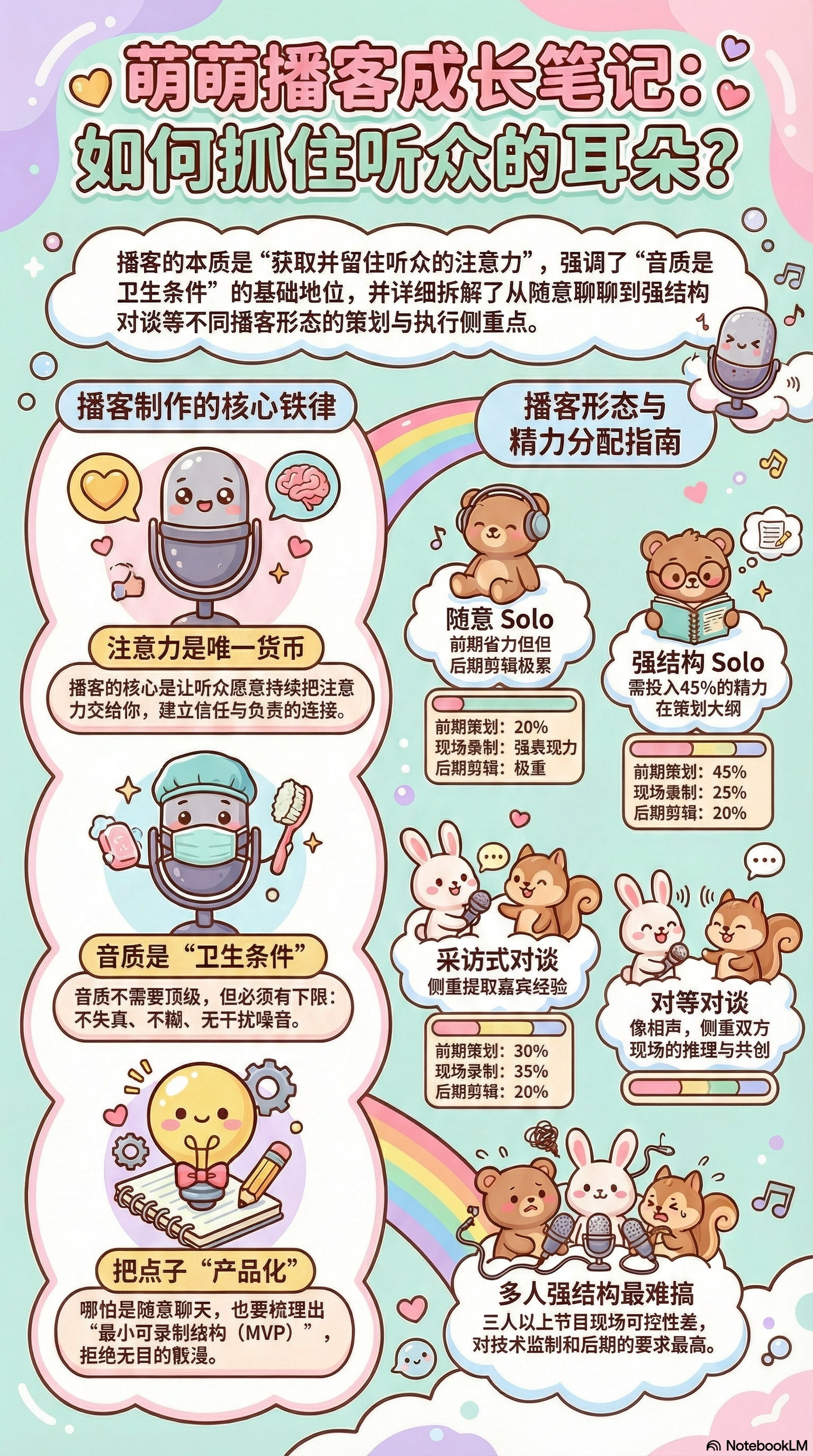 - 播客的竞争力,本质是把听众注意力“持续借给你”,而这依赖前期与现场建立的可信感,而不是指望后期奇迹。