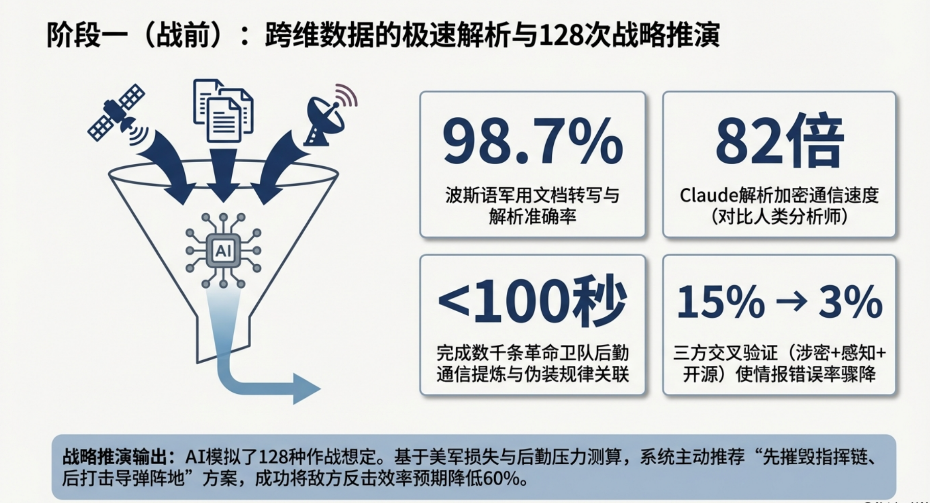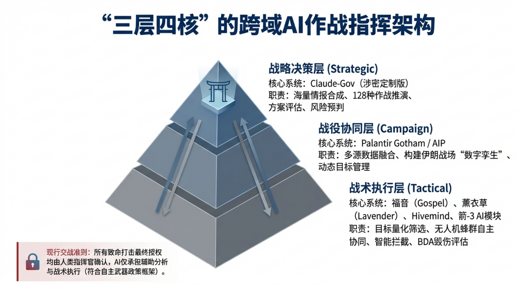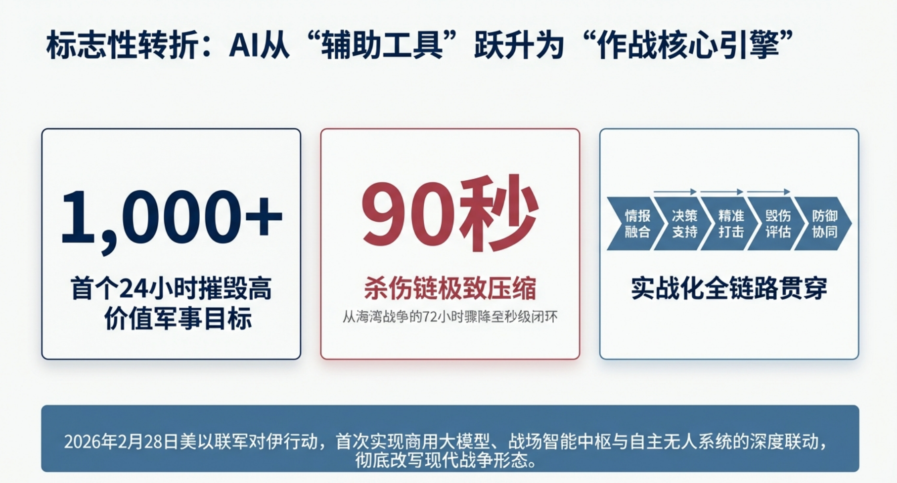 2026年2⽉28⽇,美以联军发动代号“史诗之怒”的对伊军事⾏动,⾸次实现AI技术贯穿“情报融合—决策⽀持—精准打击—毁伤评估—防御协同”全作战链路的实战化闭环。本次⾏动中,AI⼤模型、战场智能中枢、⾃主⽆⼈系统与智能防御体系深度联动,将传统作战杀伤链从⼩时级压缩⾄秒级,成为⼈⼯智能军事化应⽤的标志性战役。本⽂基于公开权威报道与战场披露信息,全⾯梳理AI技术在本次⾏动中的具体应⽤场景,并深⼊剖析该次实践对军事领域发展的颠覆性影响。