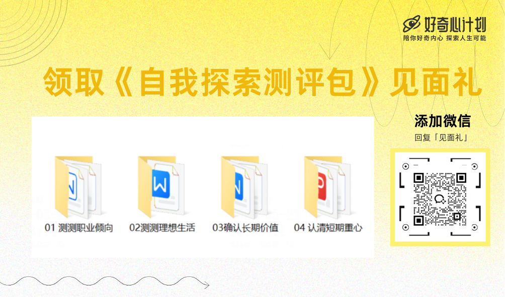 所有听众可以通过关注微信公众号「好奇心计划」回复“见面礼”,添加运营伙伴获取一份「自我探索测评包」见面礼;或直接在下方二维码扫码关注❤️