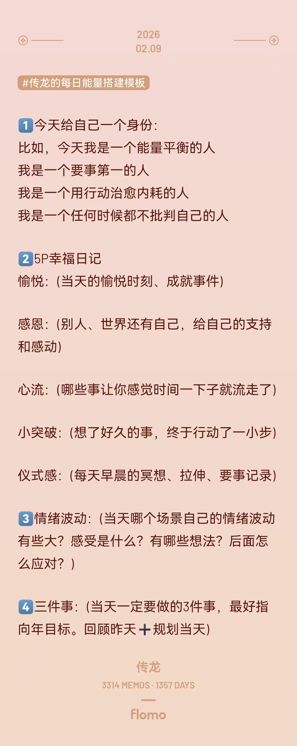 · 传龙:Flomo + 自创能量日记模板(身份锚定+5P+每天三件事)