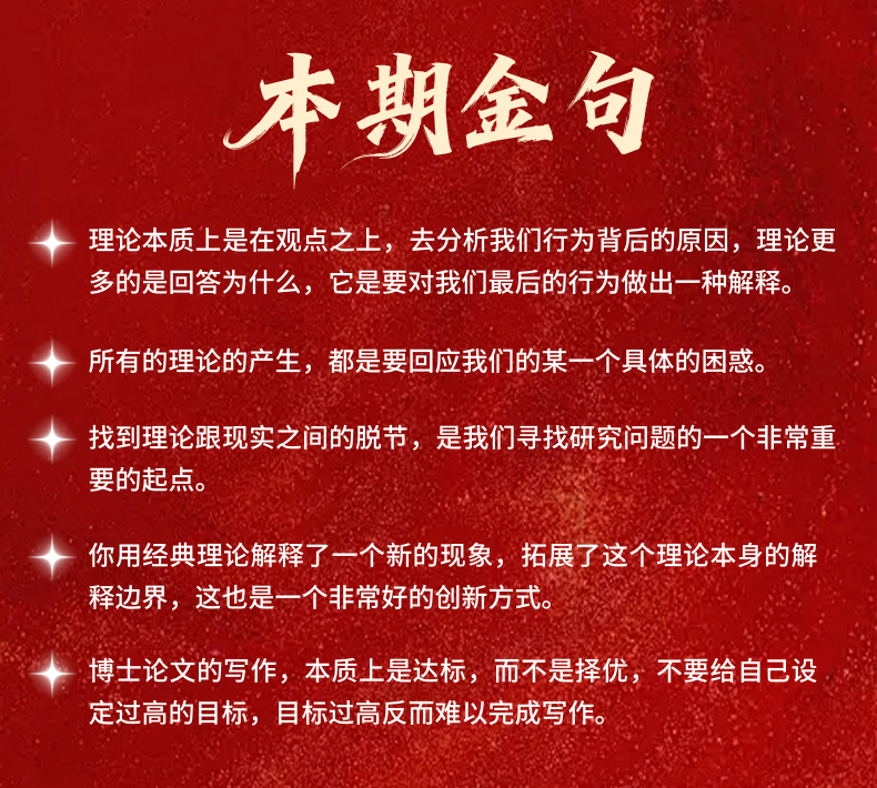 无论是正在选题、开题的在读博士生,还是陷入写作卡点、对理论应用束手无策的学术研究者,都能在这场对谈中掌握博士论文理论运用的全流程逻辑,跳出“只描述事实写流水账”“为了创新硬造理论”的写作误区。
