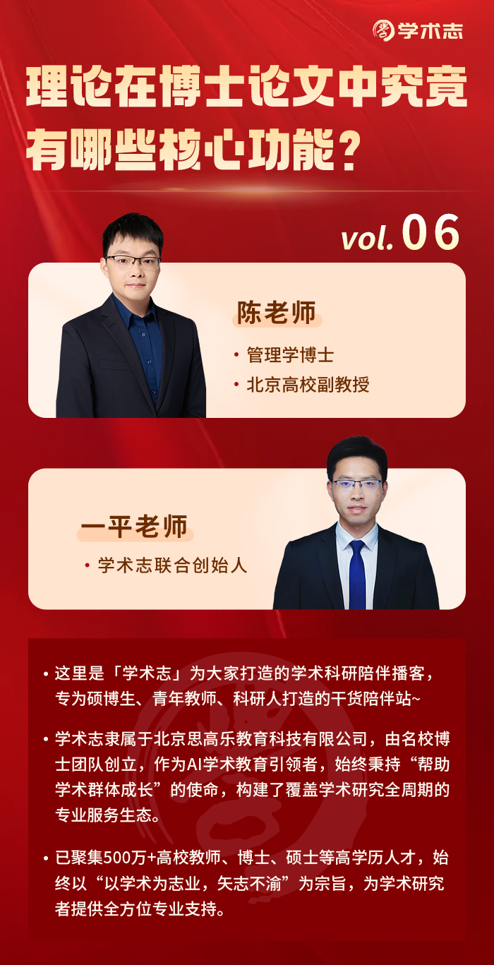 这里是#学术志官方播客#第六期,本期特邀管理学博士、北京高校副教授陈老师,深度拆解理论在博士论文写作中的核心功能与落地应用!