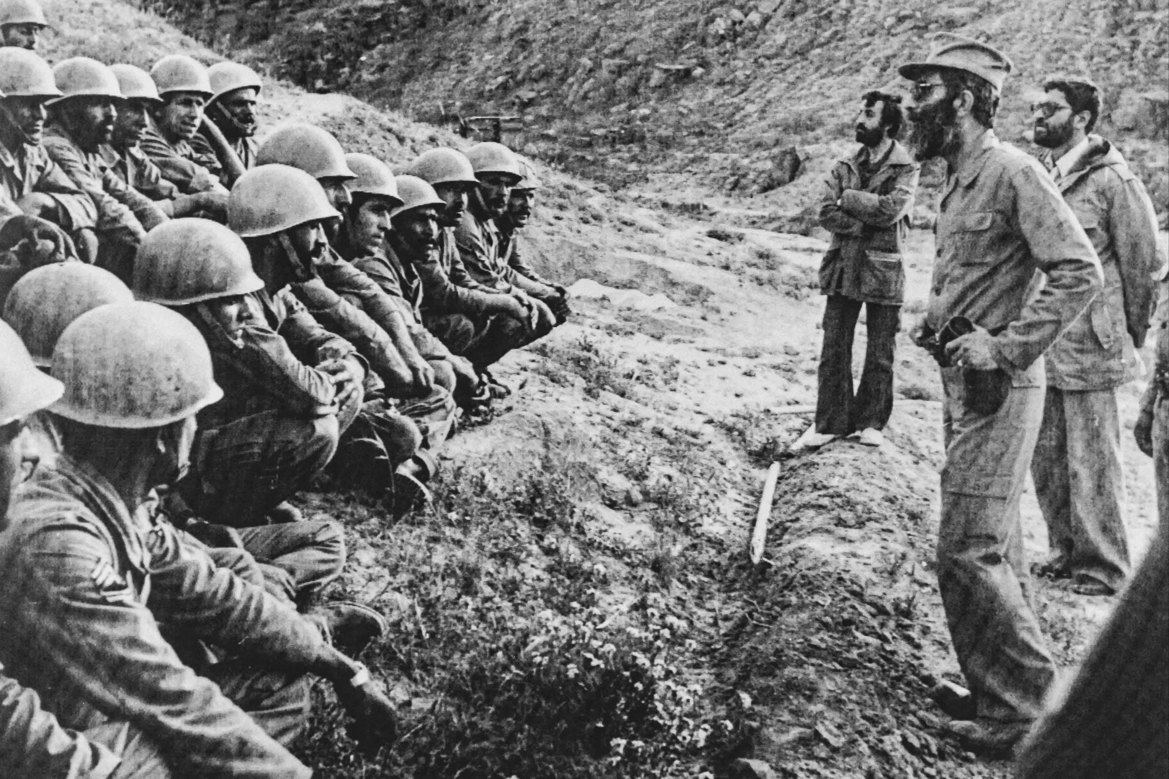 哈梅内伊(右立)在伊朗-伊拉克战争前线向坐着的伊朗士兵发表讲话。