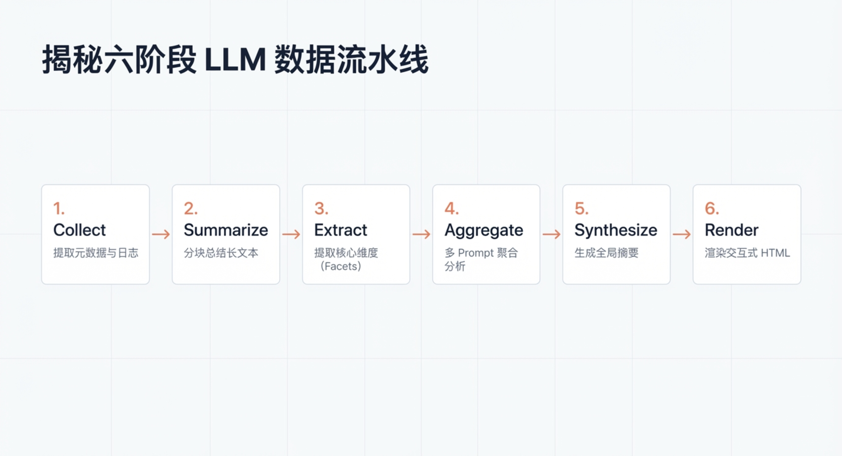 - 聚合与渲染:最后,将所有统计数据和 AI 生成的叙述性见解(如“令人印象深刻的工作流”或“未来机会”)整合,渲染成一个可交互的 HTML 页面。