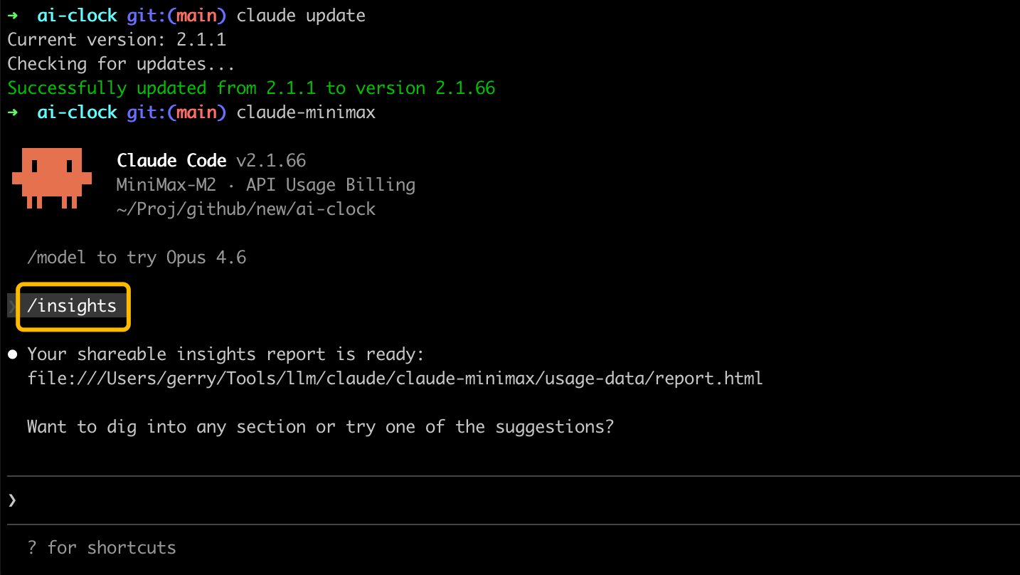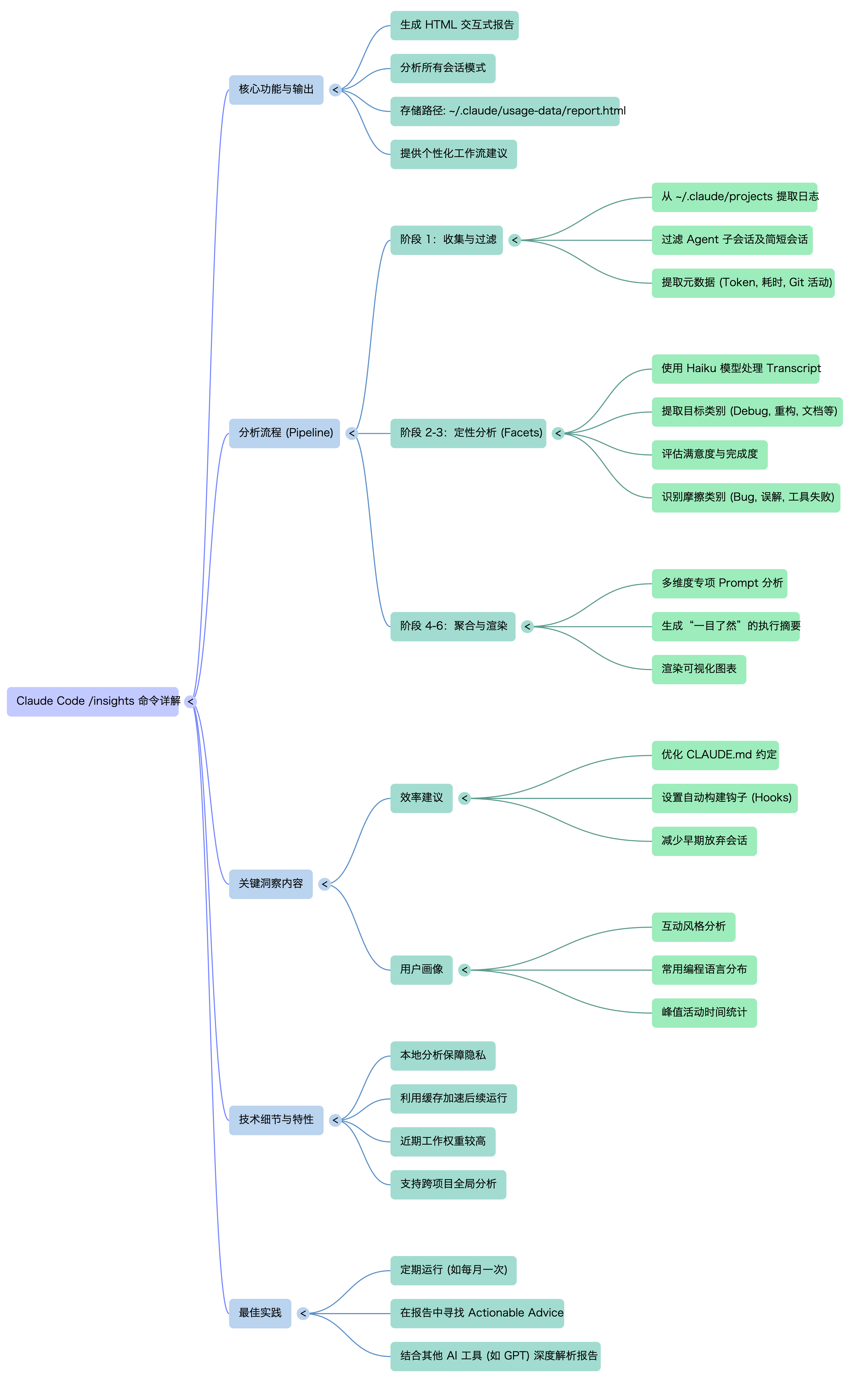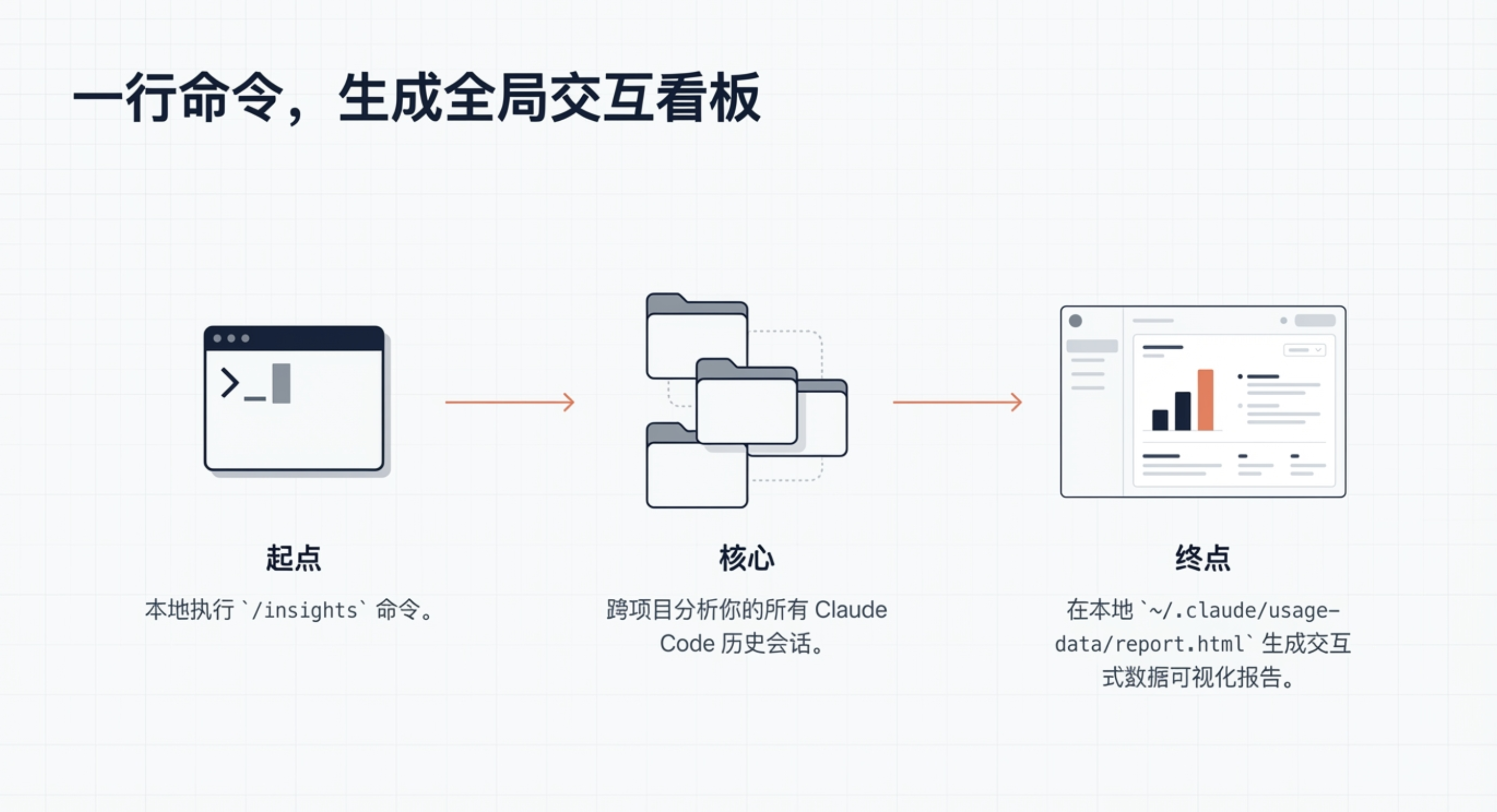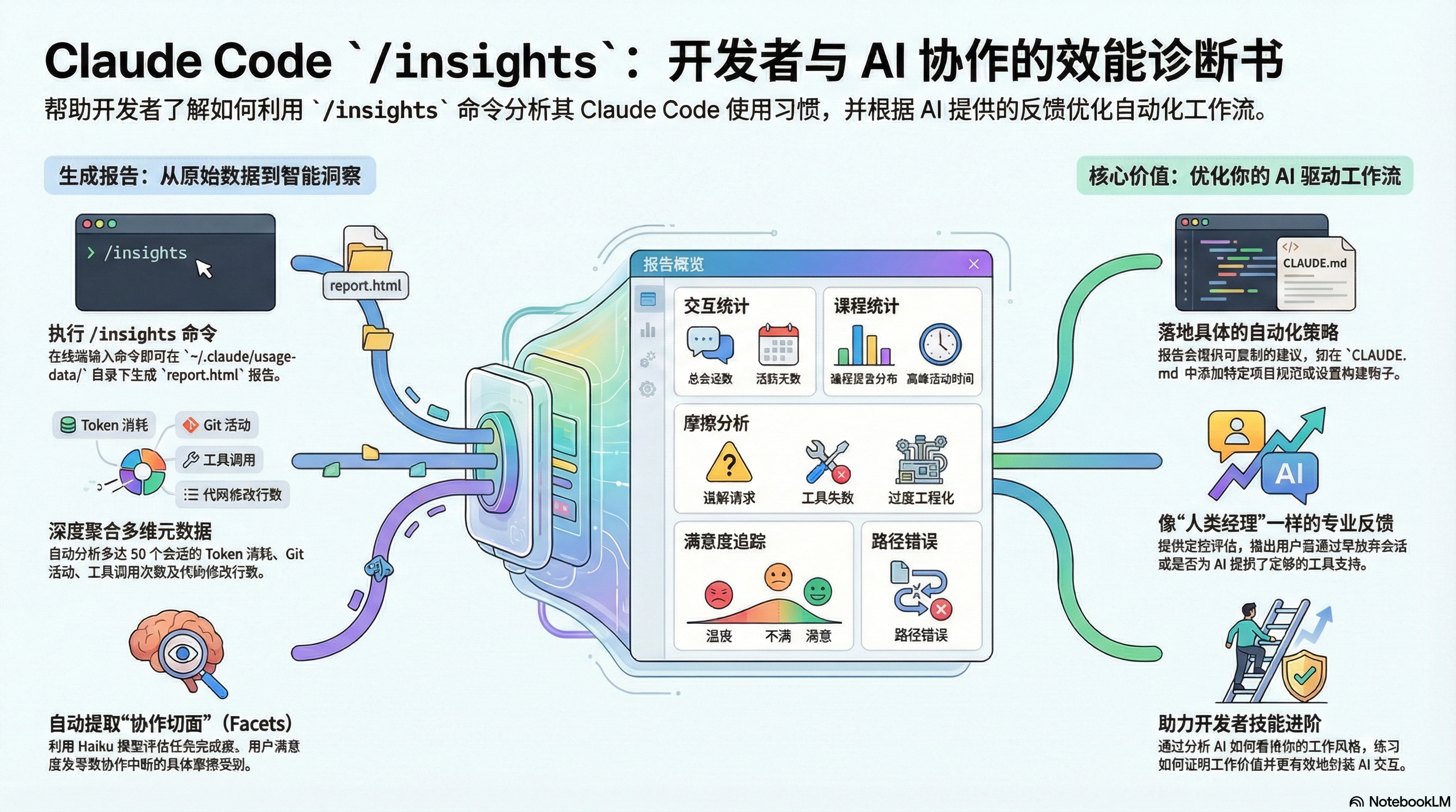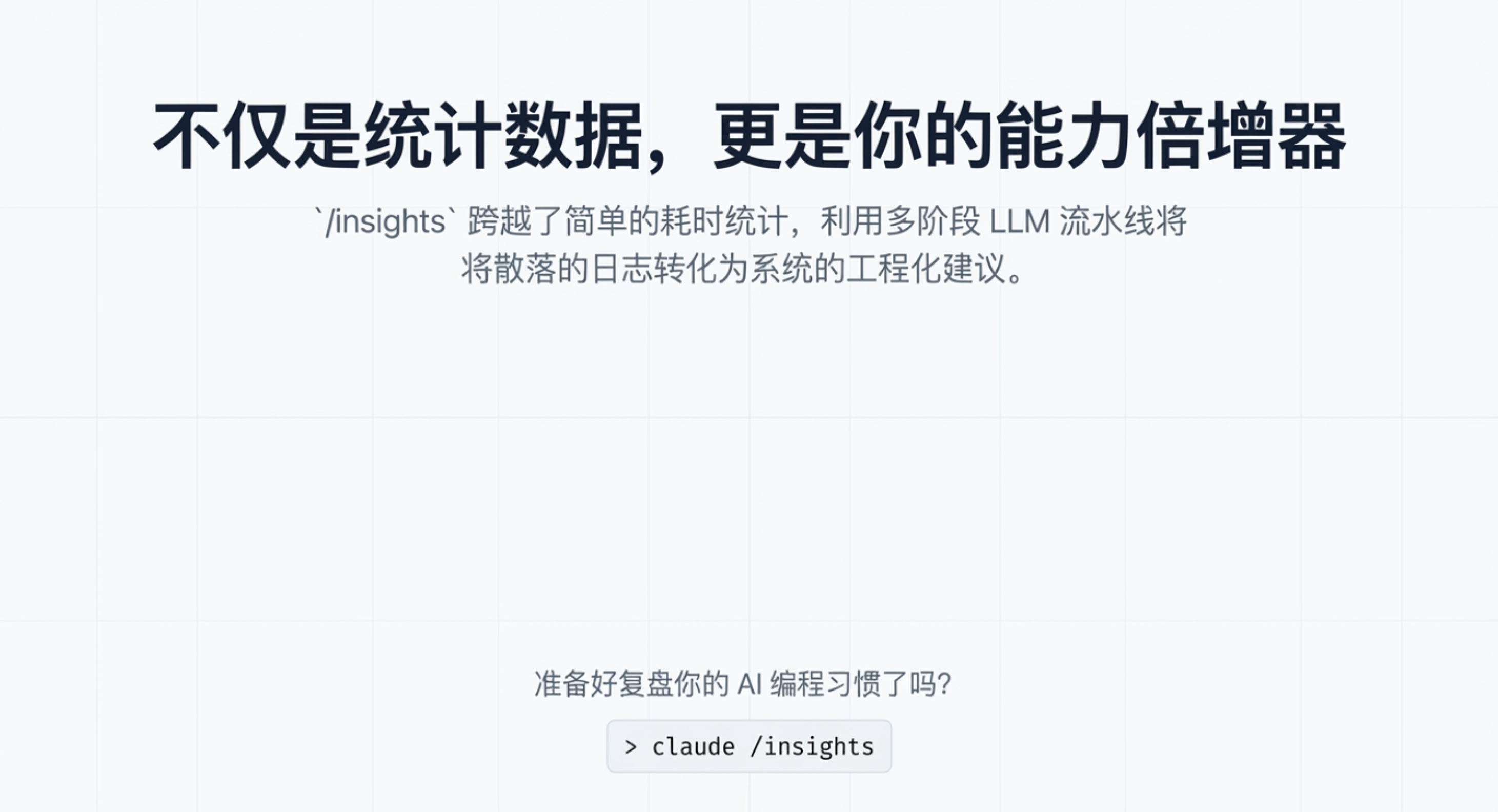 /insights不是一个简单的统计工具,而是一个将你的开发行为“数据化”、“可视化”、“可反思化”的镜子。它用 AI 的视角,帮你看见自己作为开发者的模样——你的高效模式、你的摩擦点、你的独特风格。在 AI 日益深入工作流的今天,学会与这样的反馈共舞,或许正是我们保持进化、不被工具定义的关键。
