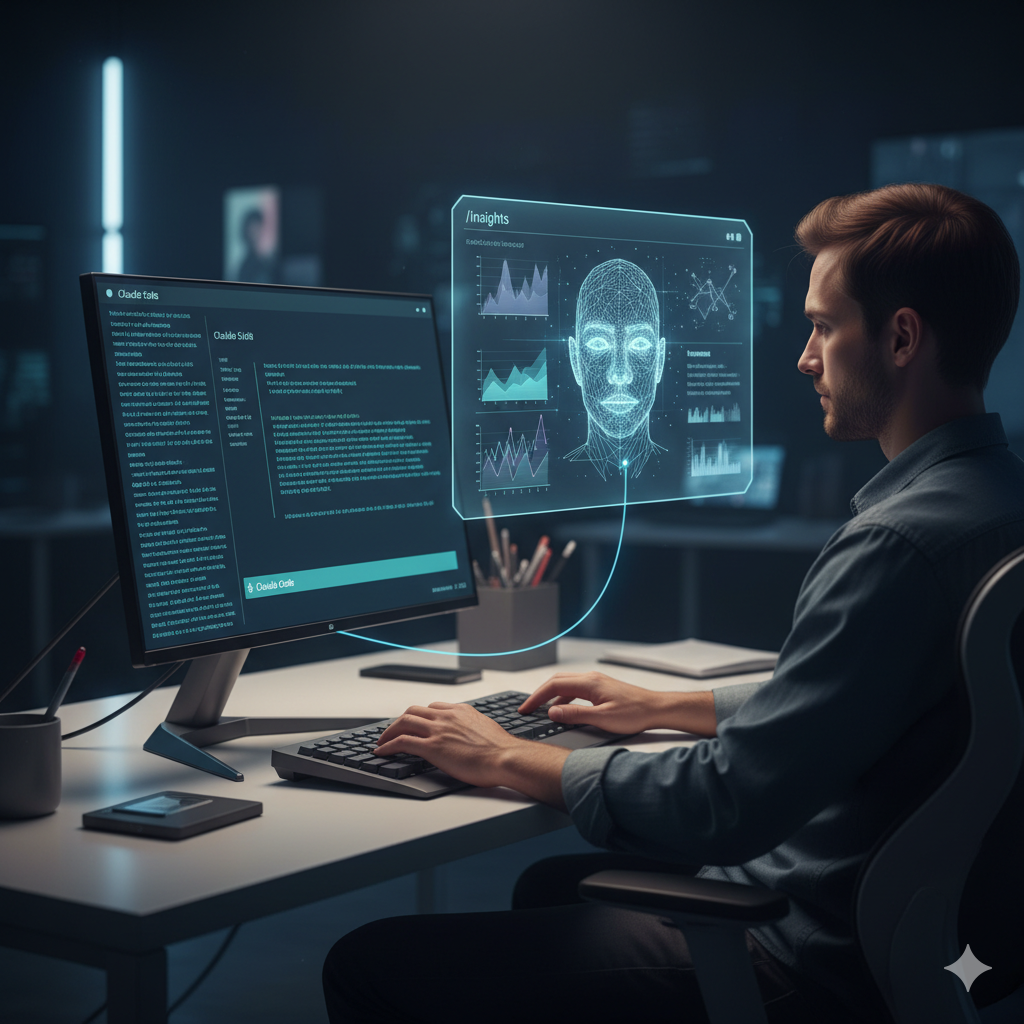 封面提示词:A developer sits at a desk, working at their computer. On the main screen is the familiar Claude Code CLI. Floating above the desk, slightly transparent and glowing, is a second screen displaying the /insights HTML report. On this report, we see a mix of clean data charts and, intriguingly, a faint, stylized portrait of the developer's own face emerging from the data points, as if seeing their reflection. The report screen is connected back to the developer by a thin, glowing thread, symbolizing feedback and learning. The style is clean, futuristic, and slightly introspective, with a palette of dark mode blues and soft neon glows.